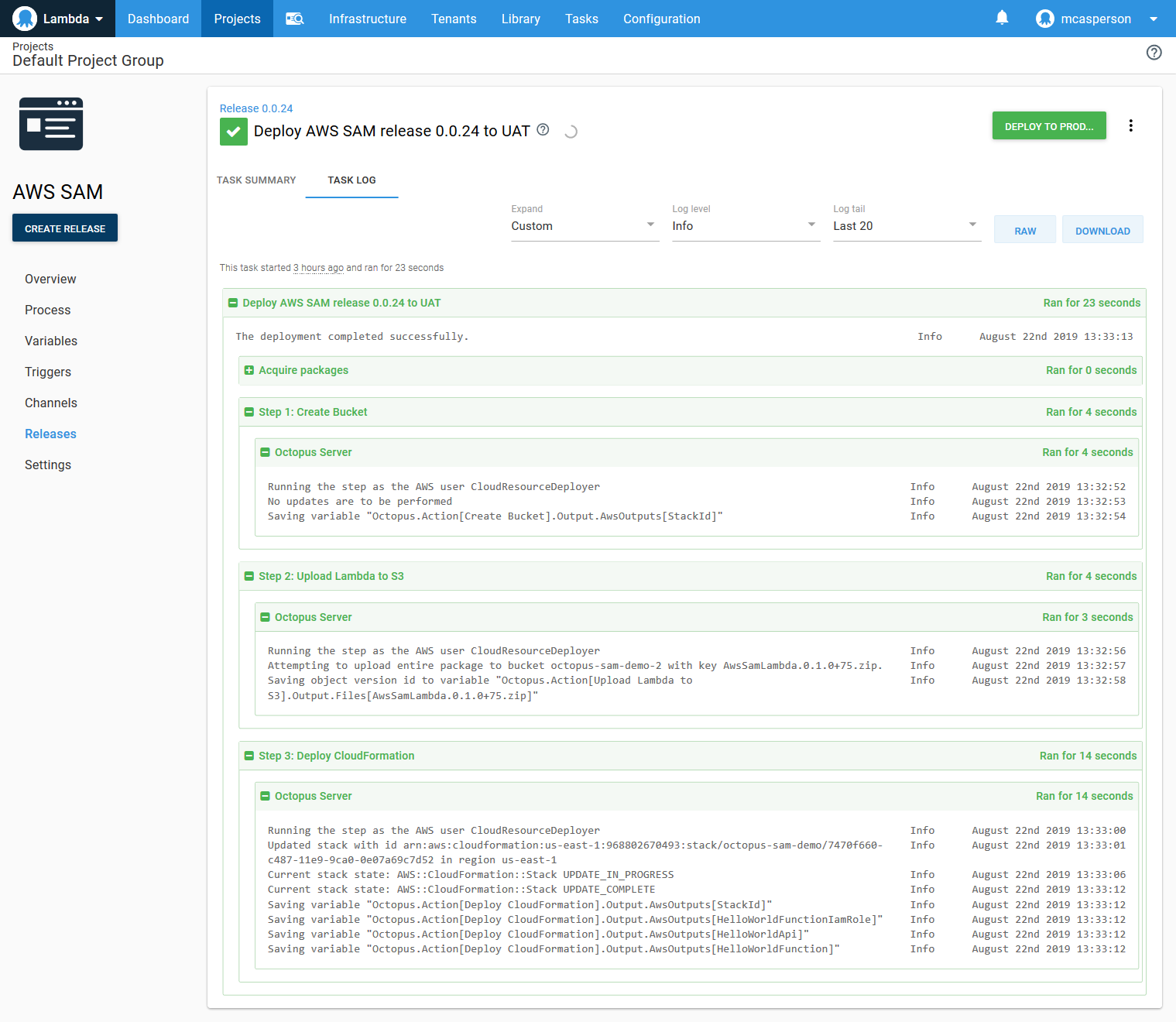 We have successfully created a deployment process in Octopus that replicates the functionality of the SAM CLI tools.
