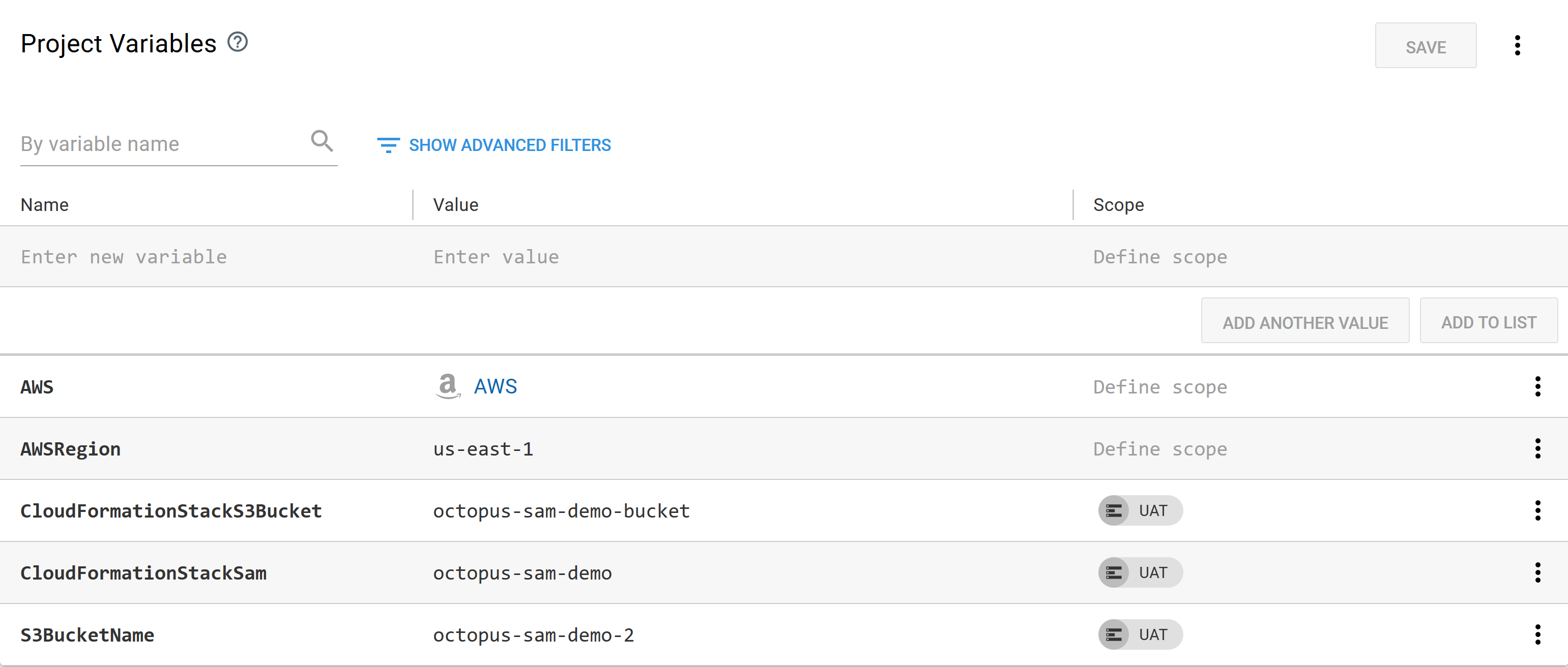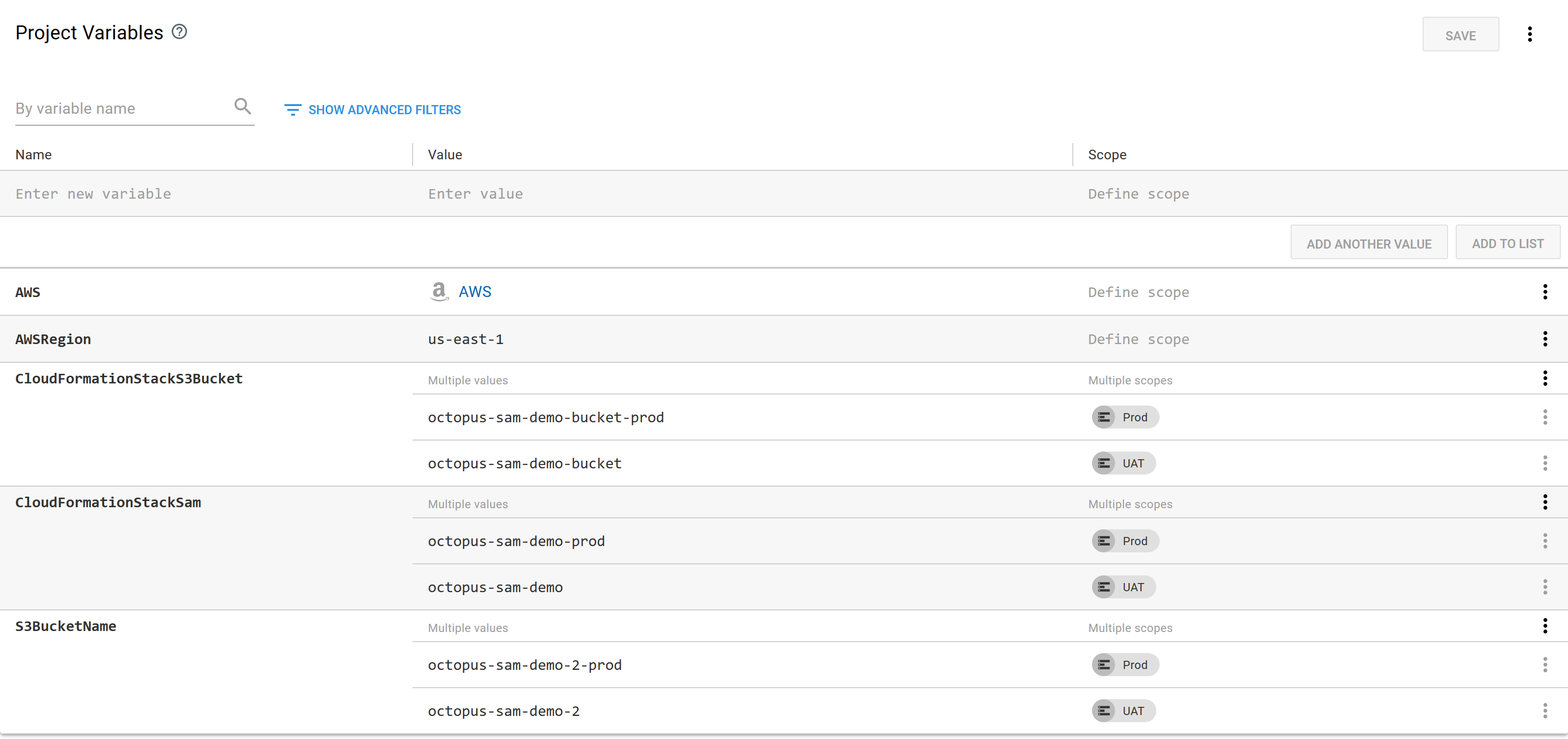 In this case we add new values for the CloudFormationStackS3Bucket, CloudFormationStackSam, and S3BucketName variables scoped to the next environment called Prod.