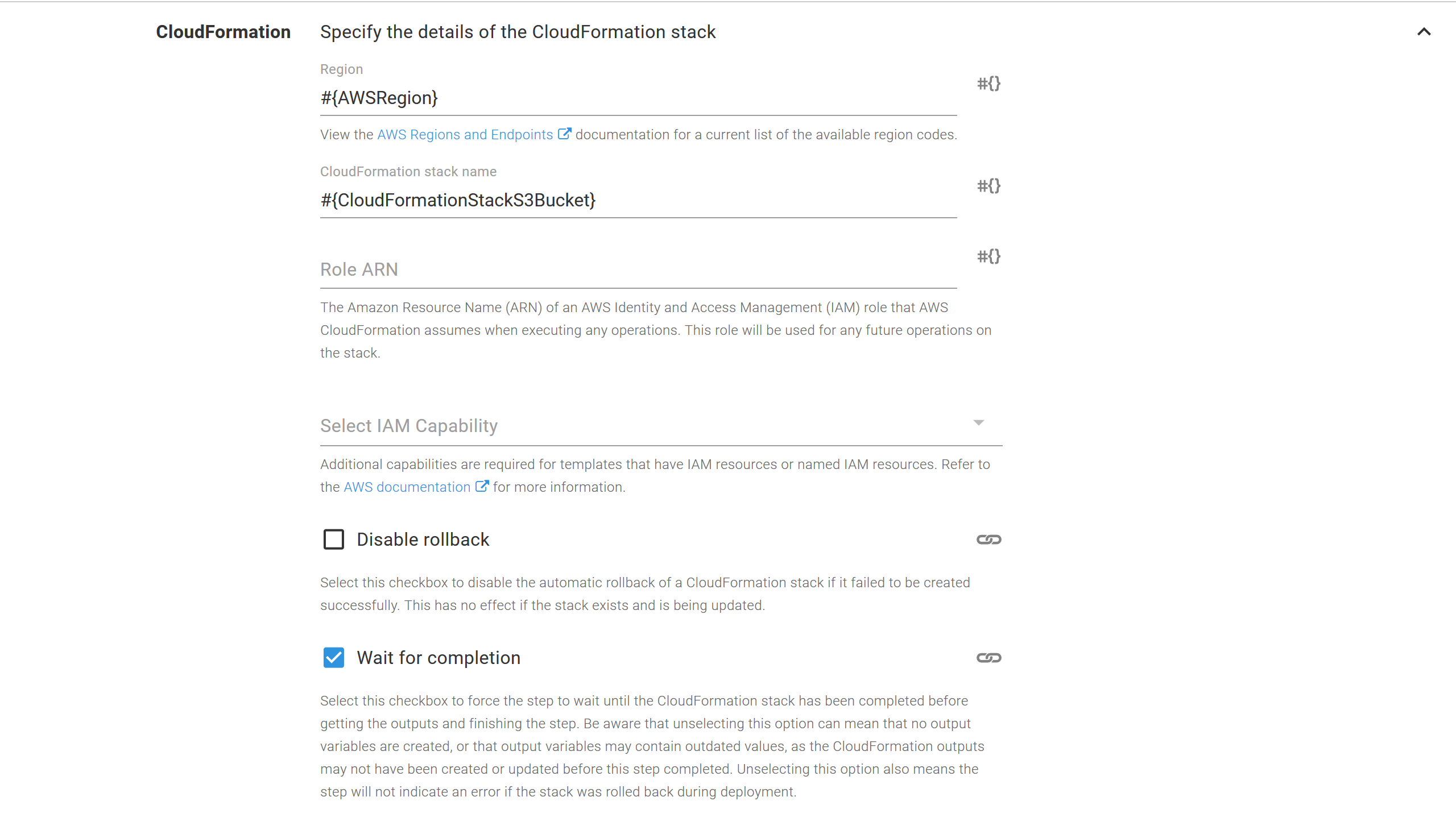 The only thing of note in this step is that we have again used a variable for the bucket name and AWS region:
