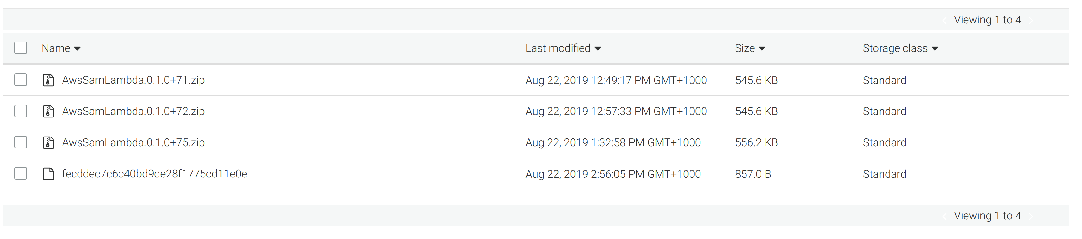 We have also ensured that the packages we upload have readable names like AwsSamLambda.0.1.0+71.zip, which clearly indicate the application and version they contain. As you can see from the screenshot below, the packages uploaded by us (AwsSamLambda.0.1.0+xx.zip) offer a lot more context than the packages uploaded by sam package (fecddec7c6c40bd9de28f1775cd11e0e):