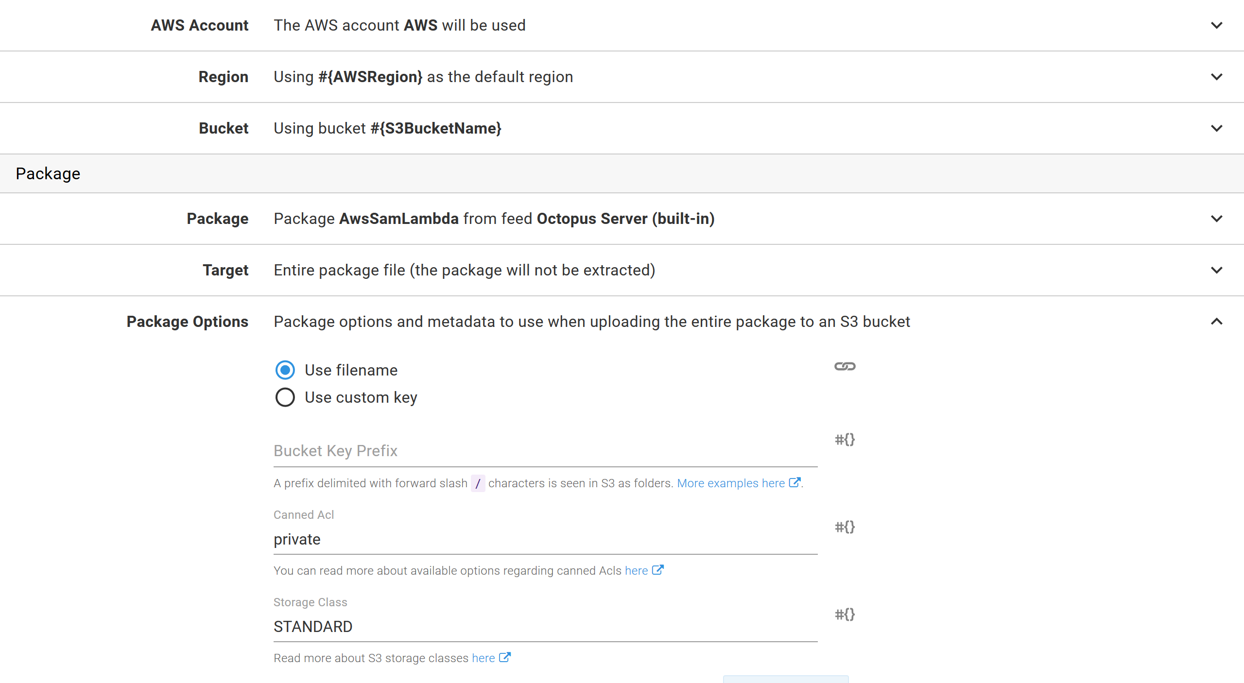 CodeUri: "s3://#{Octopus.Action[Upload Lambda to S3].Aws.S3.BucketName}/#{Octopus.Action[Upload Lambda to S3].Output.Package.FileName}"