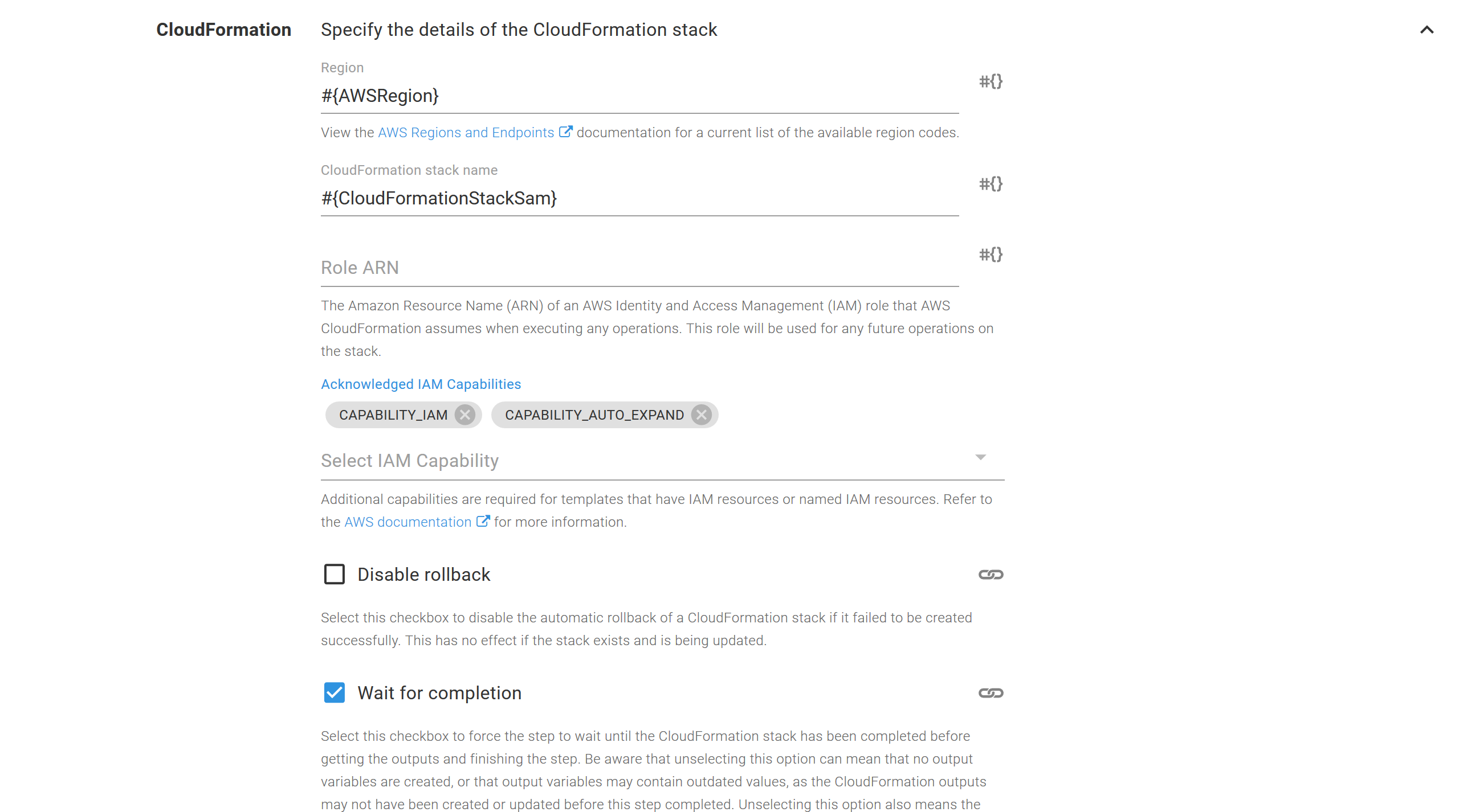 The CloudFormation settings define the region and stack name as variables. This will be important as we move to deployments across multiple environments: