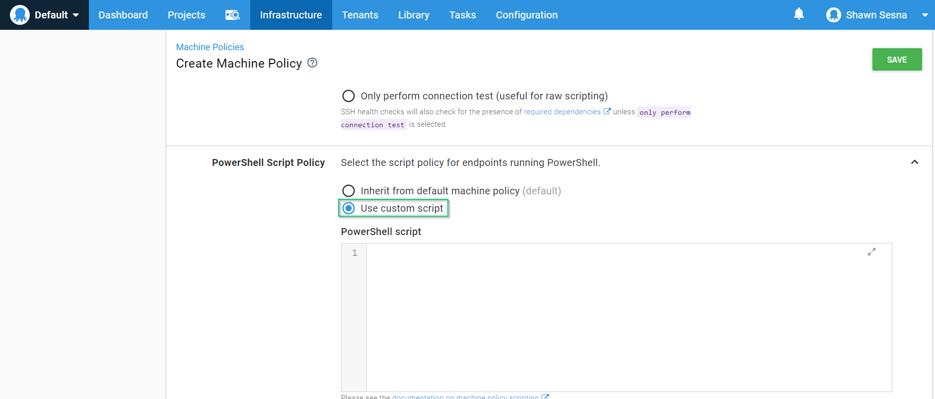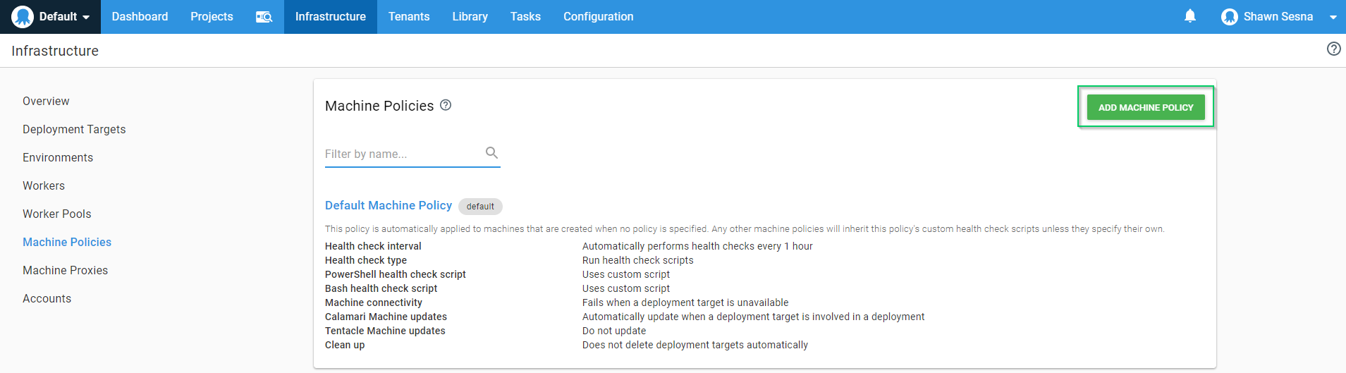 To accomplish this, navigate to the Infrastructure tab and click on Machine Policies. Once there, click the Add Machine Policy button: