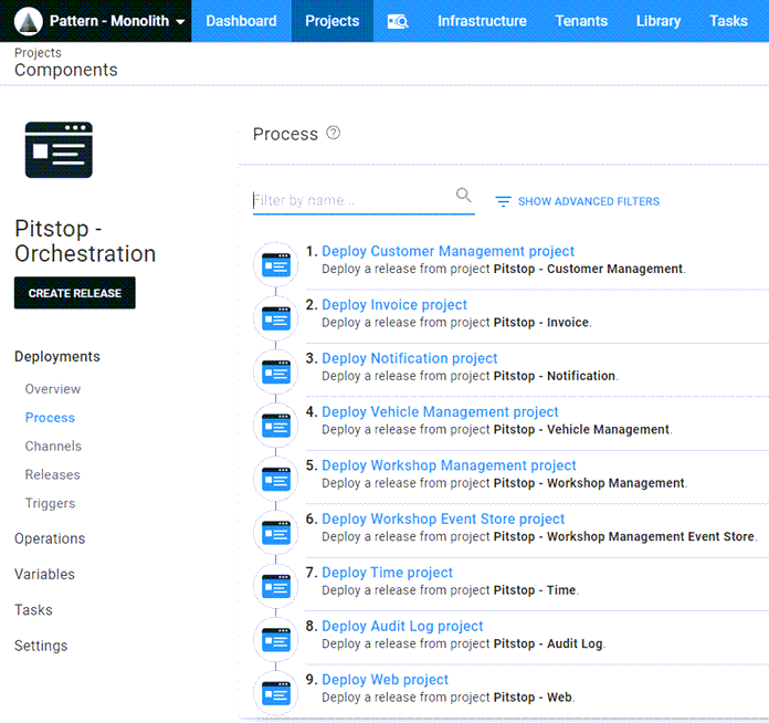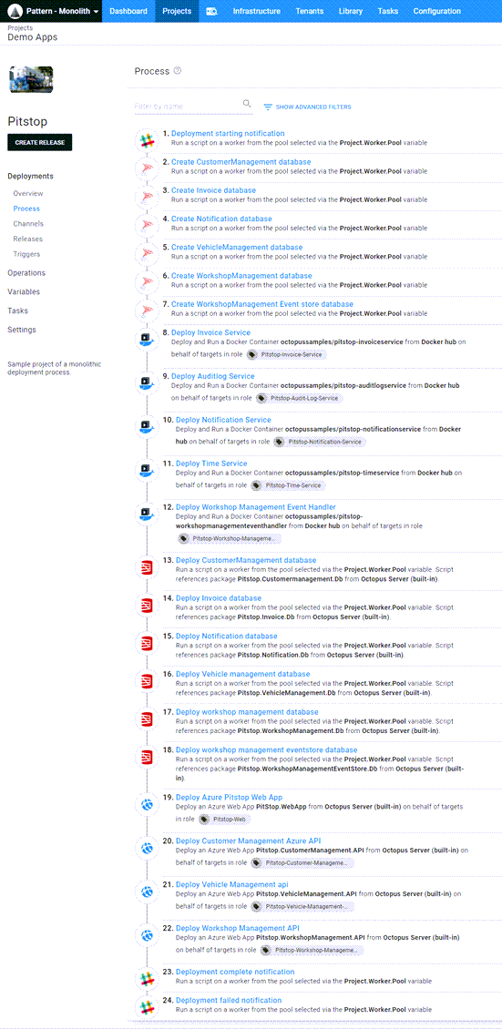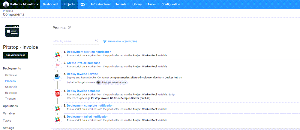 Looking at our deployment process, we can identify some of the steps that are related while others are independent. For example, the steps for the invoice service are all related, so those can be broken out into their own Octopus project: