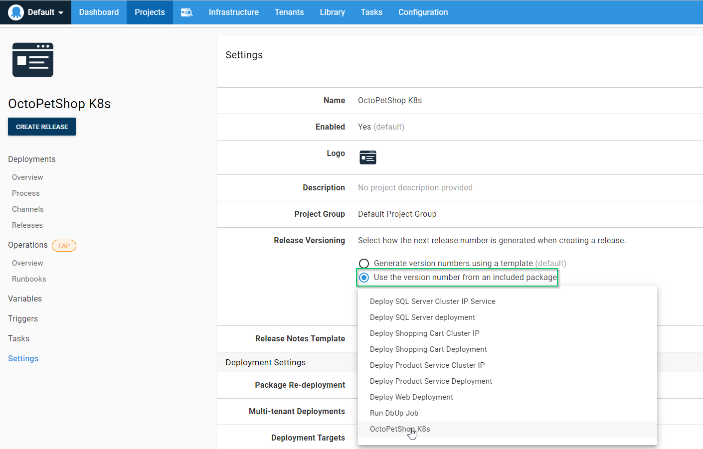 Choose Use the version number from an included package, then select our OctoPetShop.K8s package: