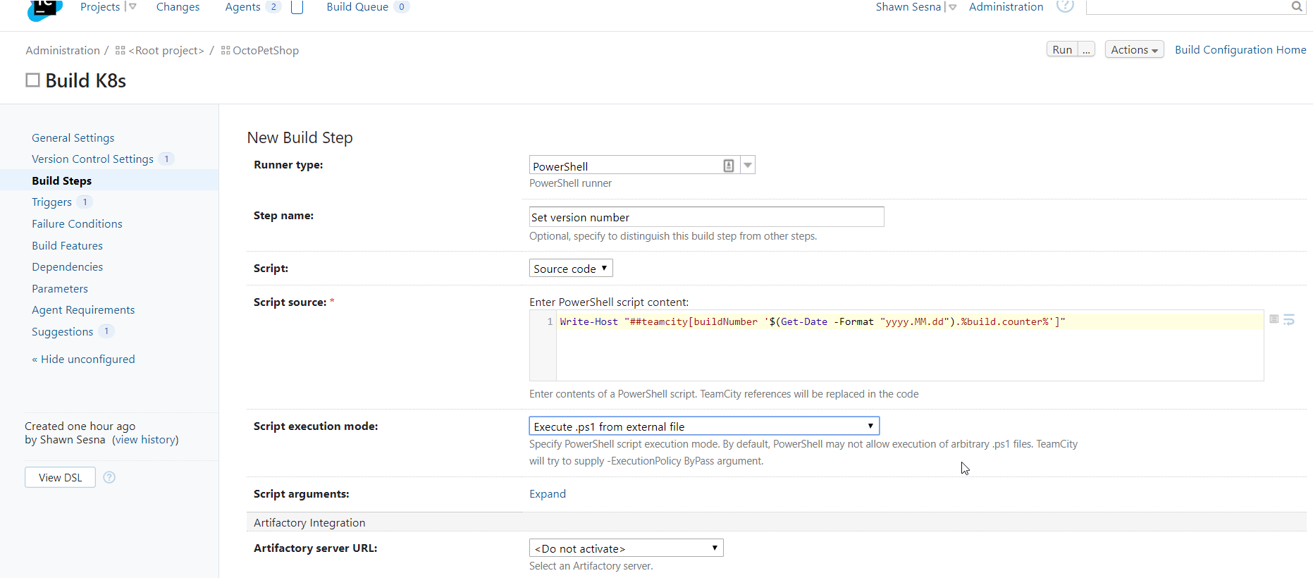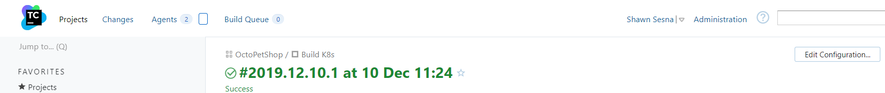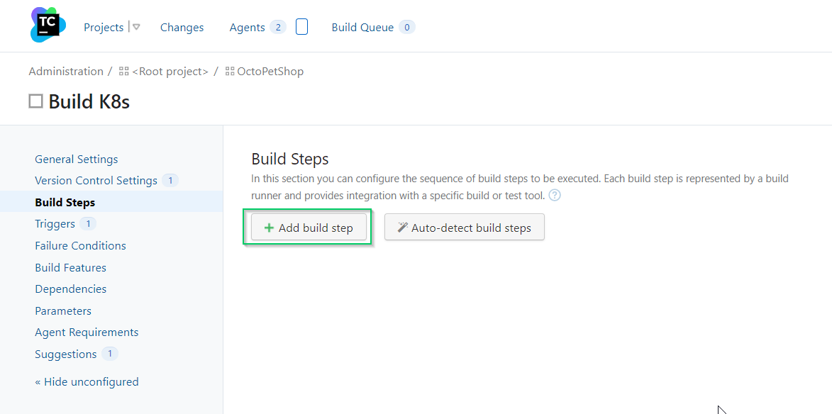 Kubernetes doesn’t have anything that needs to be built, other than the Docker images it uses. However, the YAML files that we created can be placed in source control and versioned so using a build server is still relevant. Our OctoPetShop repo contains a k8s folder where we’ve placed all of the YAML files necessary to create our cluster. We’ll use this repo as our source. We’re using TeamCity as our build server for consistency.