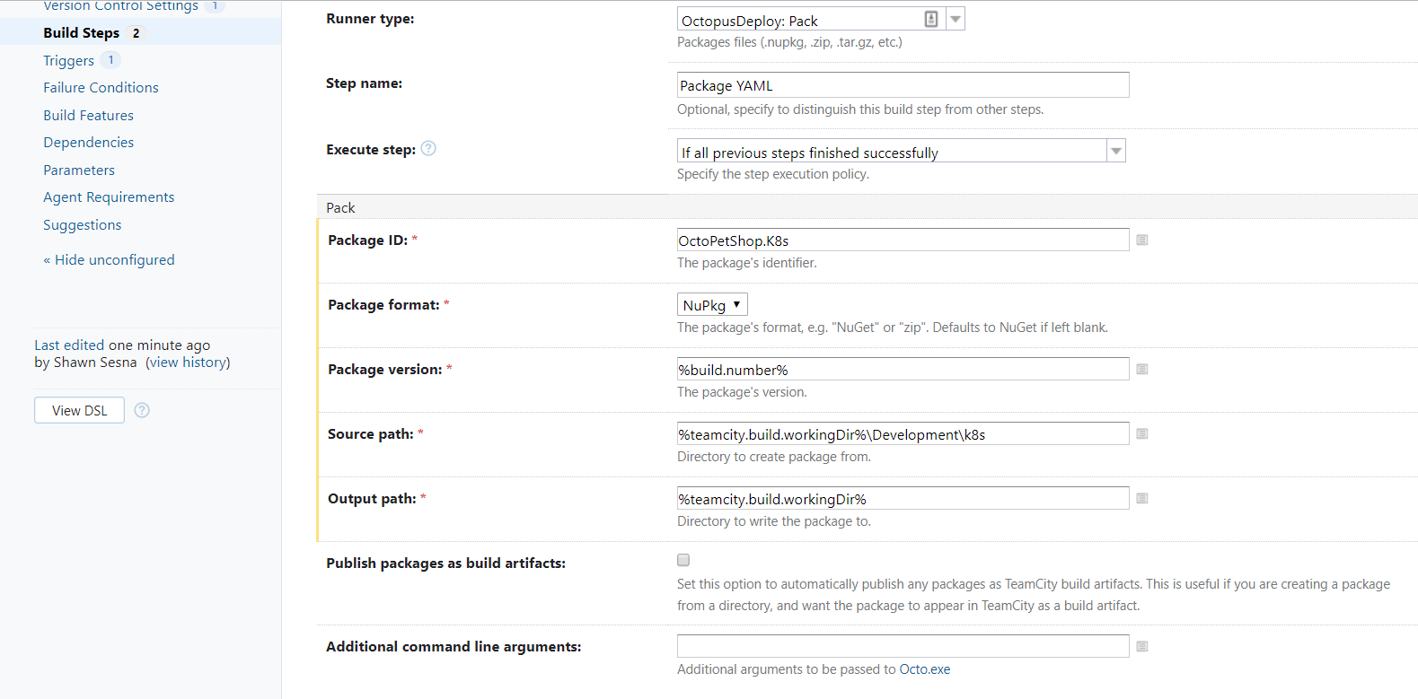 Using the Octopus Deploy Pack step, we can package all of the YAML for our deployment into a NuGet package.
