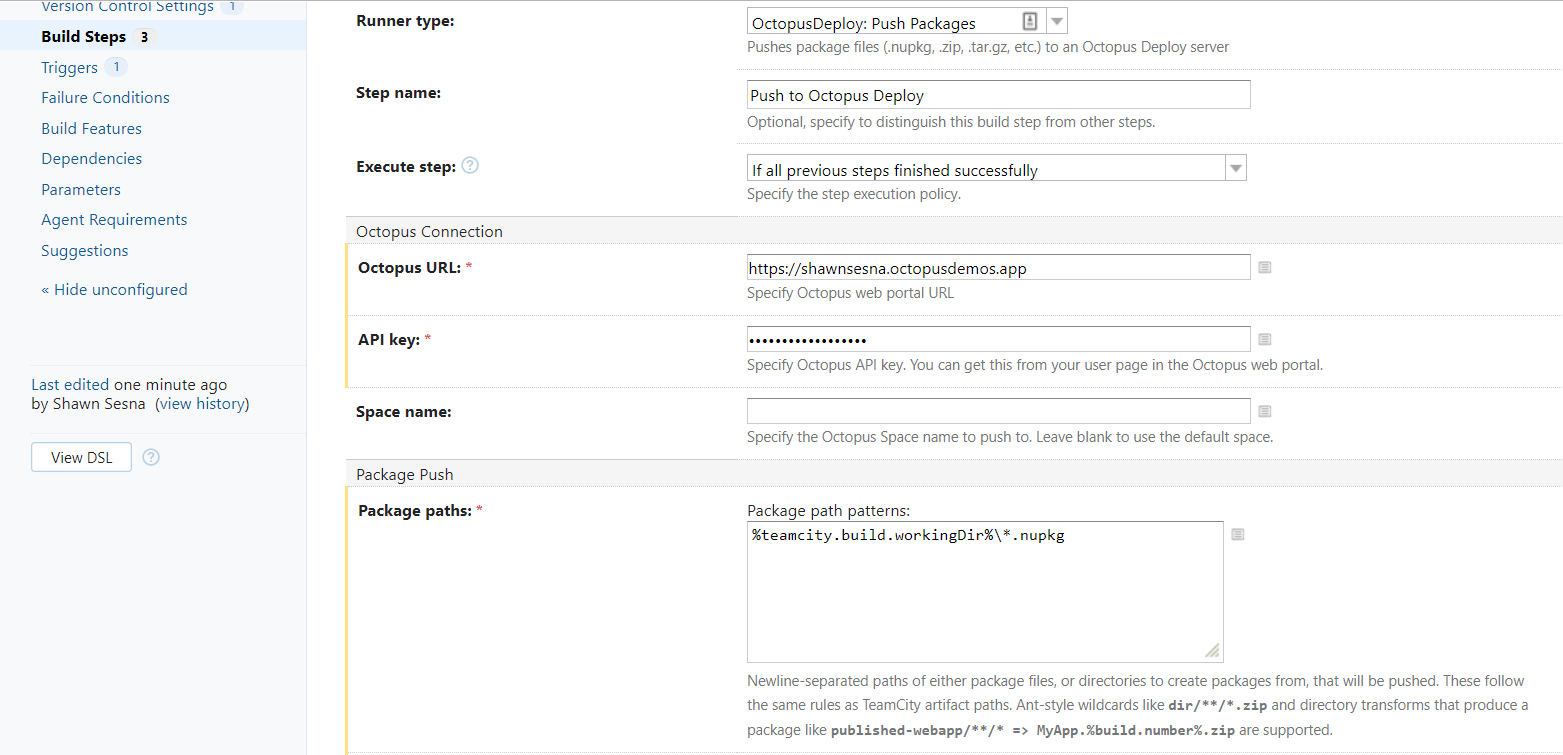 With the Octopus Deploy Push step, we can ship our NuGet package to Octopus Deploy.