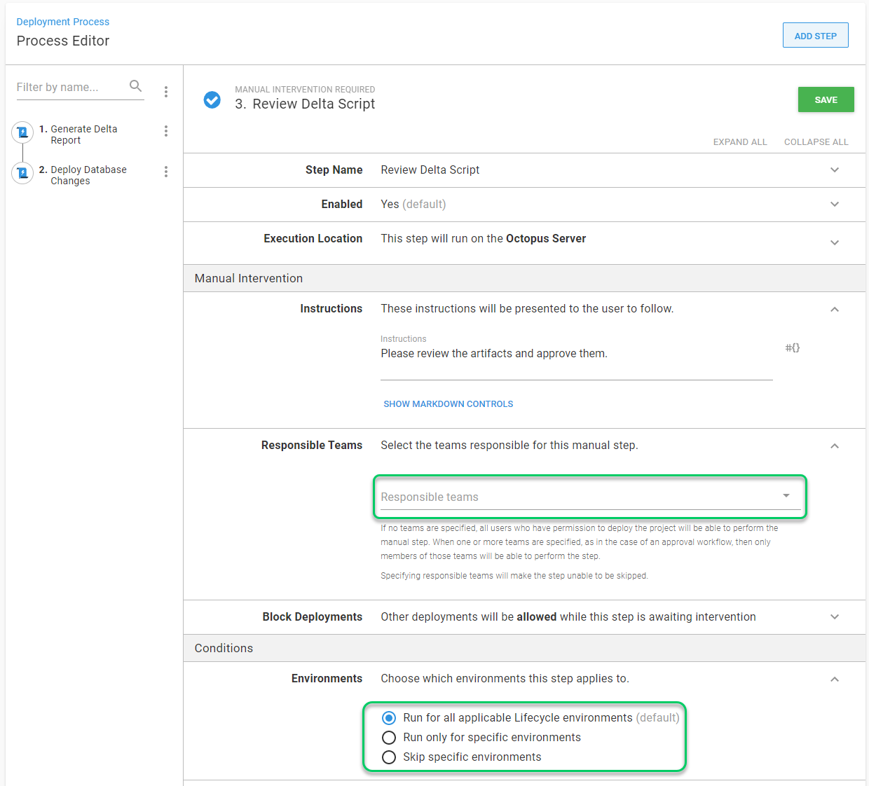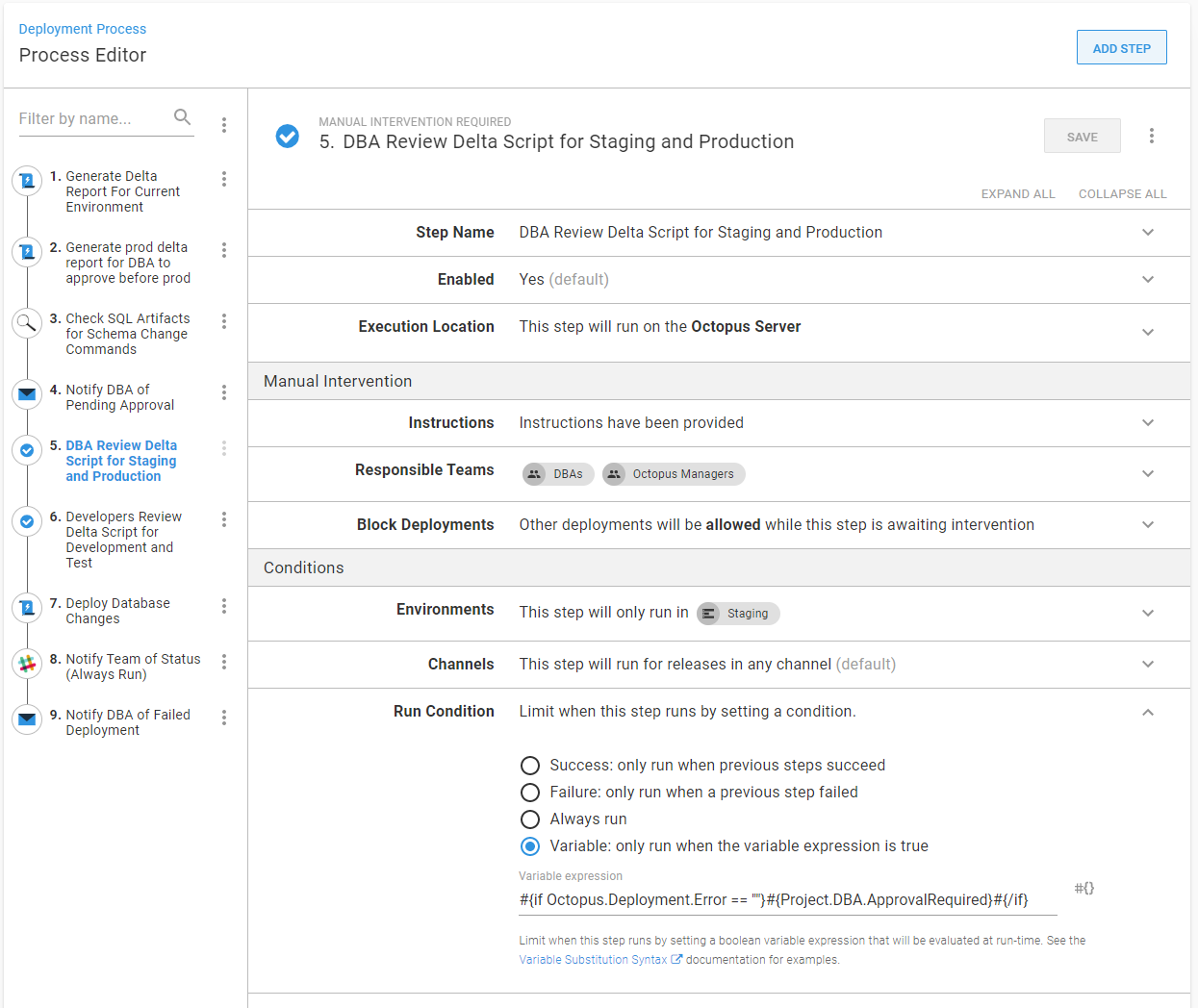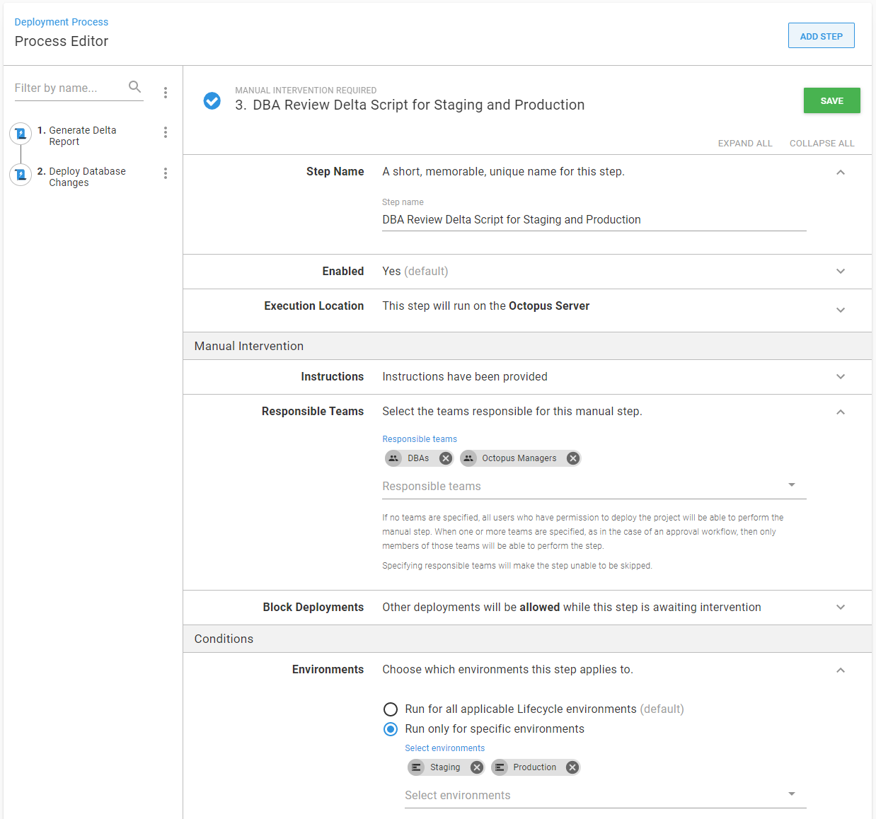 An interesting thought comes up when creating a manual intervention. A team must be selected. I know what you’re thinking. “The team should be DBAs!” This step is going to run for all environments. When should a DBA review changes? They are busy keeping the database servers up and running. Having to review every delta script for every deployment would be a full-time job.