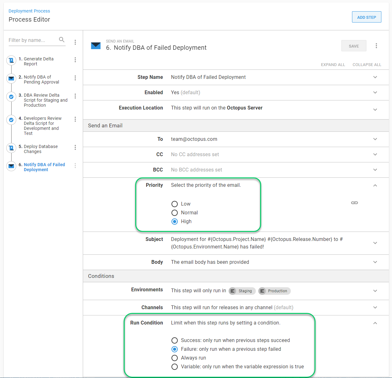 The failure notification is a bit different. The priority of the email needs to change from normal to high, and the run condition should be configured only to run the step on failure.