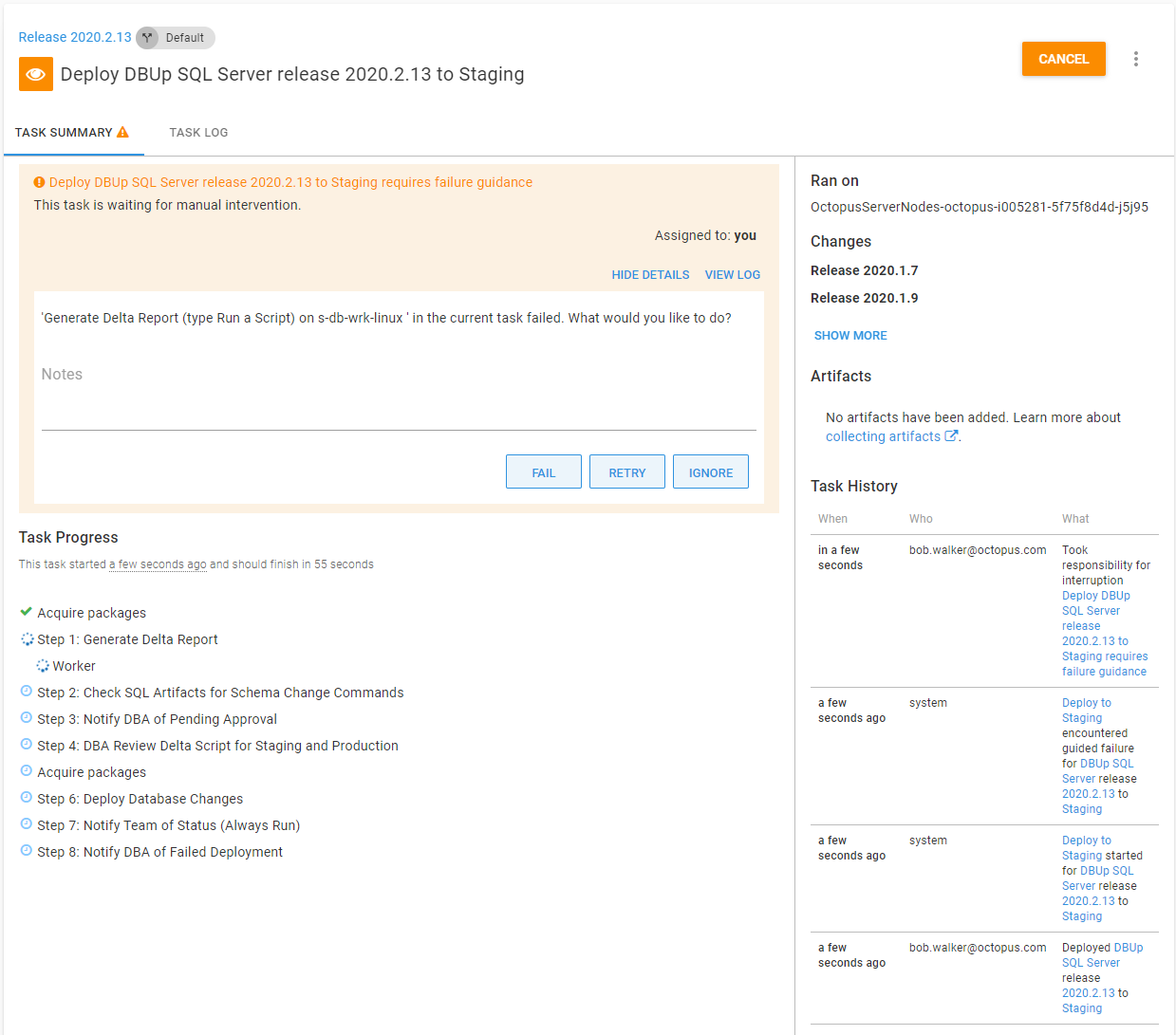 Errors and failures will happen. A number of them occur because of something out of the control of Octopus Deploy, for instance, a network failure, an SQL Server restart, incorrect permissions, and missing accounts are amongst the most common. After the issue is fixed, it would be much better just to try the failed step again and prevent unnecessary rework. If a DBA already approved a script, they don’t need to approve it again.