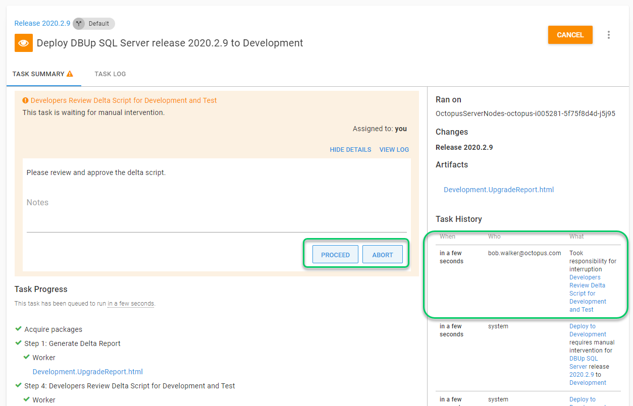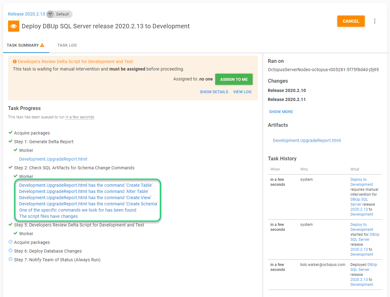 But what if the delta report shows a script with a command like drop table or drop column? Is that okay? Maybe, maybe not. It doesn’t make sense to reject the script outright. It makes more sense to pause the deployment, review the scripts, and if something doesn’t look right, find the person who created the script and discuss it with them. To do that, we can add a manual intervention.