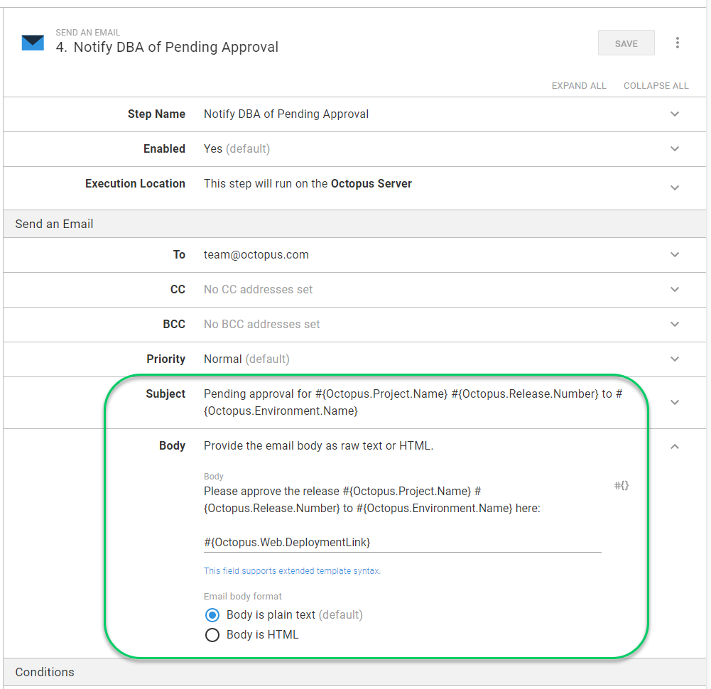The initial fields in the email form are fairly straight forward. The subject and body are what caused me to pause. The DBAs might be getting dozens of these emails a day. It should be very easy for them to approve the deployment, so the subject line should include details about the deployment. If something doesn’t look right, they can forward you the email and provide their feedback. The body should include a deep link for the approver to click on.