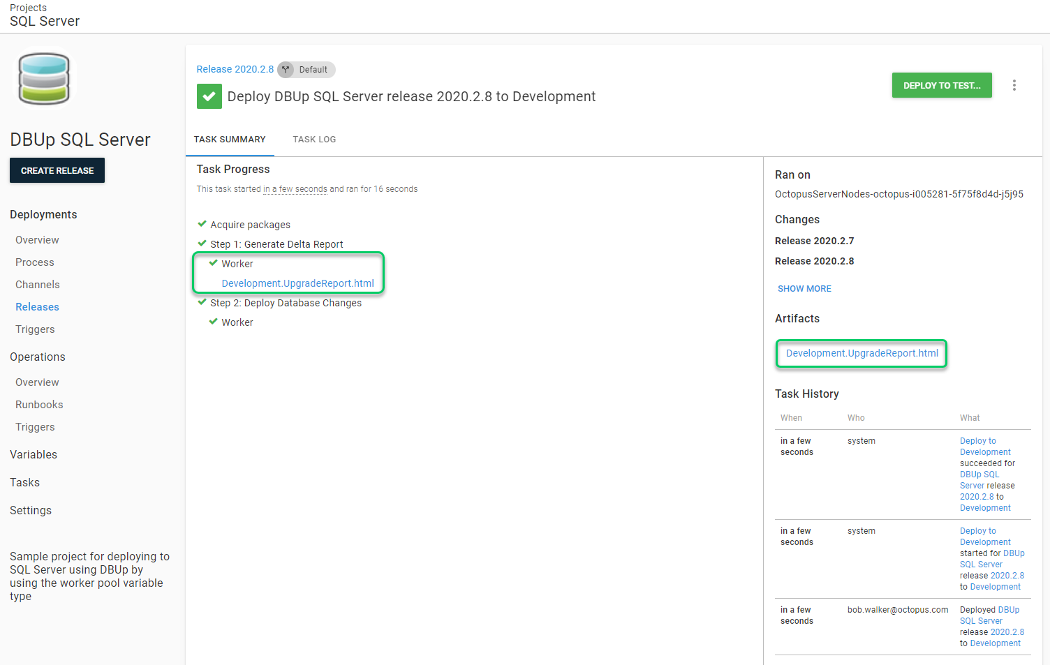 - It generates a delta report and publishes it as an Octopus Artifact for anyone to review.