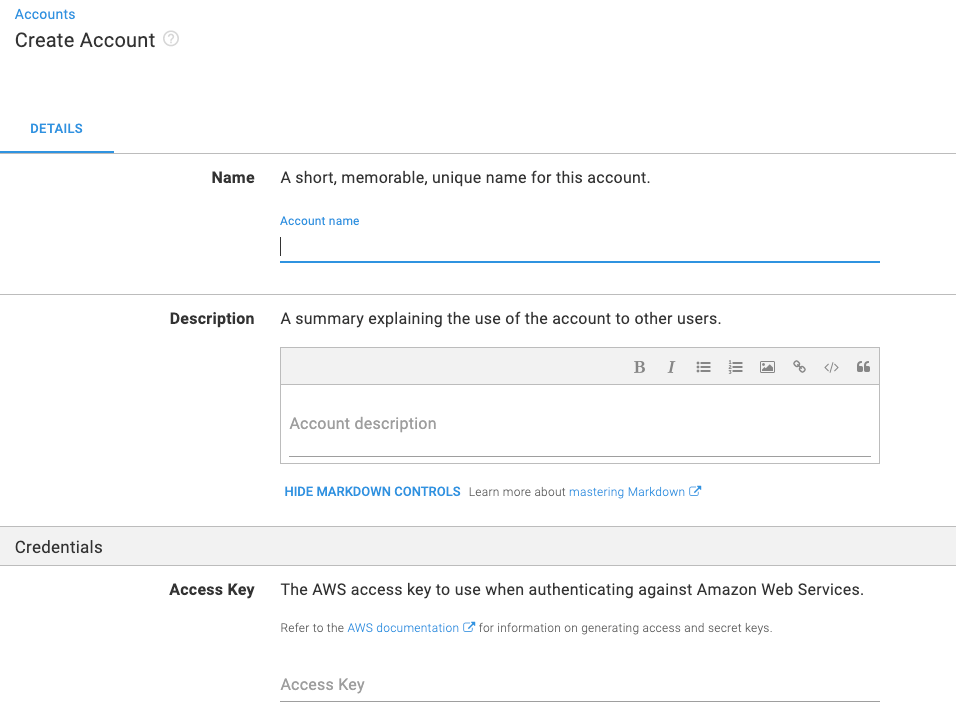 - Navigate to {{Infrastructure, Accounts}} to set up the new AWS account.