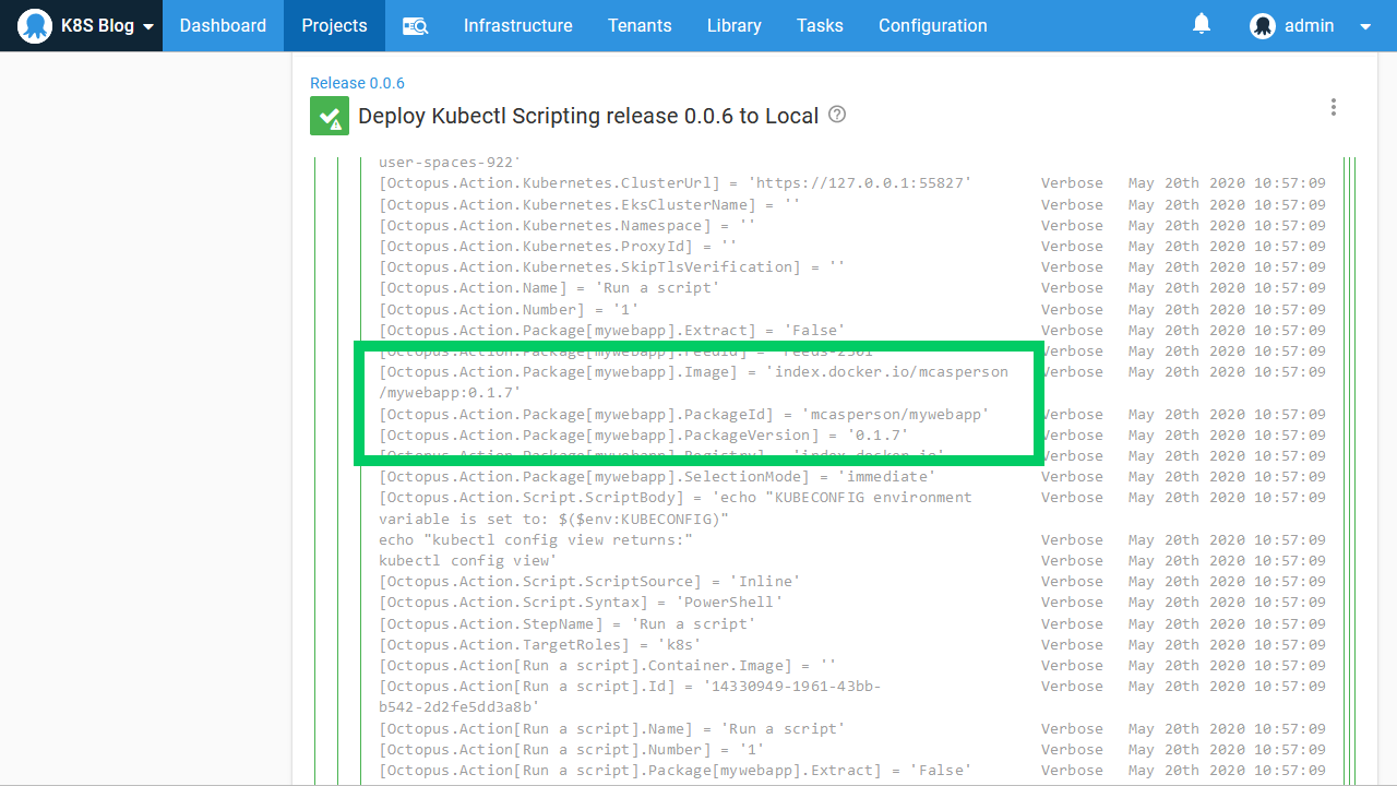 We can use these variables in our script. The example script below writes a YAML file to disk, and then uses kubectl to apply it. The image property is defined as image: #{Octopus.Action.Package[mywebapp].Image}, which will be updated with each deployment to reflect the selected Docker image: