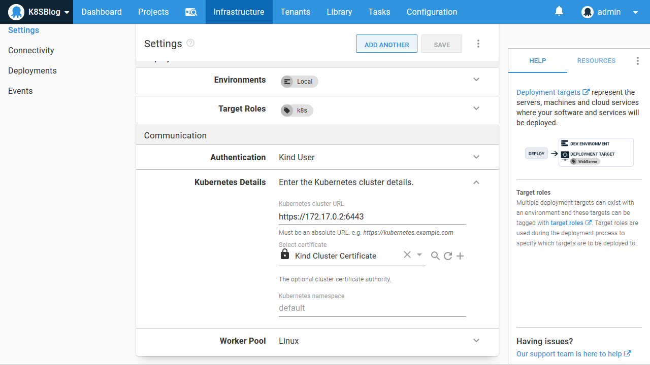 However, because we are using a Kubernetes cluster hosted in Docker with Kind, we have to do some configuration to ensure the Docker container that runs our Octopus steps can access the cluster.