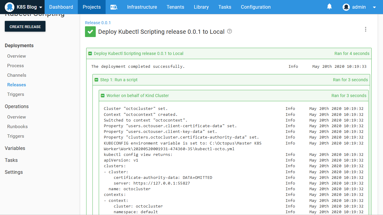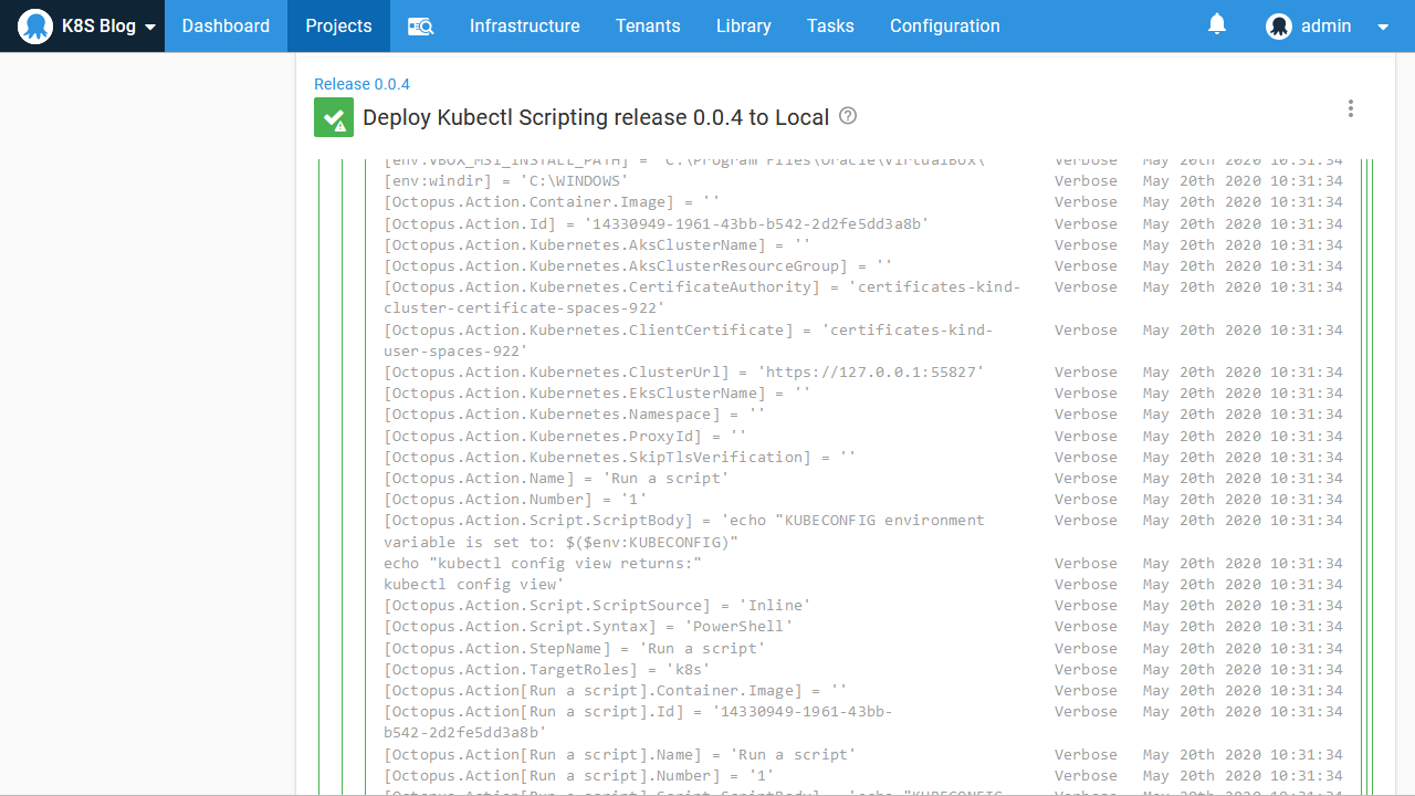 From the output, we can see that the Kubernetes configuration file has been saved to C:\Octopus\Master K8S Worker\Work\20200520001931-474360-35\kubectl-octo.yml, which is a temporary directory created to hold the working files required by the step. We can also see how the configuration file has been constructed with the details saved in the Kubernetes target.