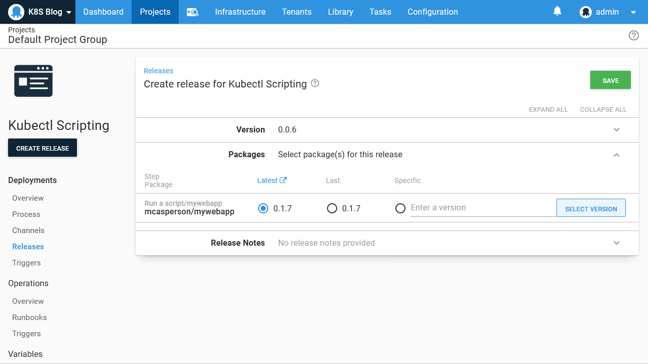 The package version is then selected during deployment:
