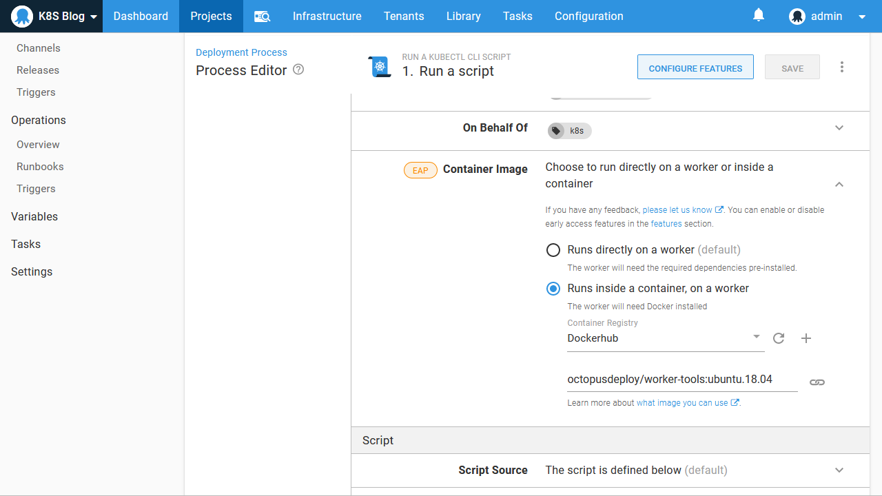 In the screenshot below the script step has been configured to run inside a Worker tool Docker image: