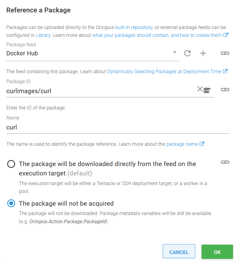 The first variable is called PackagePreRelease, and the value is set to #{Octopus.Action[Deploy HTTPD].Package[httpd].PackageVersion | VersionPreReleasePrefix}. This template string extracts the version (or image tag) from the container called httpd in the step called Deploy HTTPD, and extracts the prerelease string via the VersionPreReleasePrefix filter (available in Octopus 2020.5).