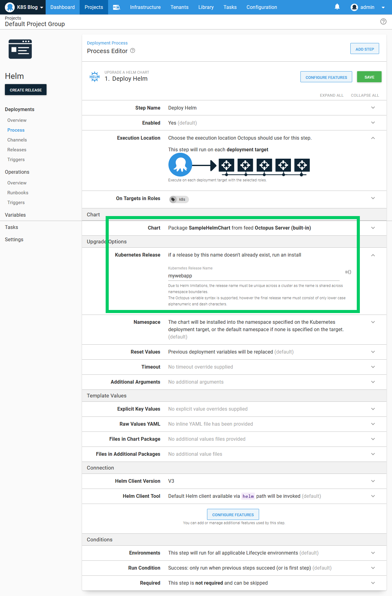 To deploy the Helm chart we’ll use the Upgrade a Helm chart step:
