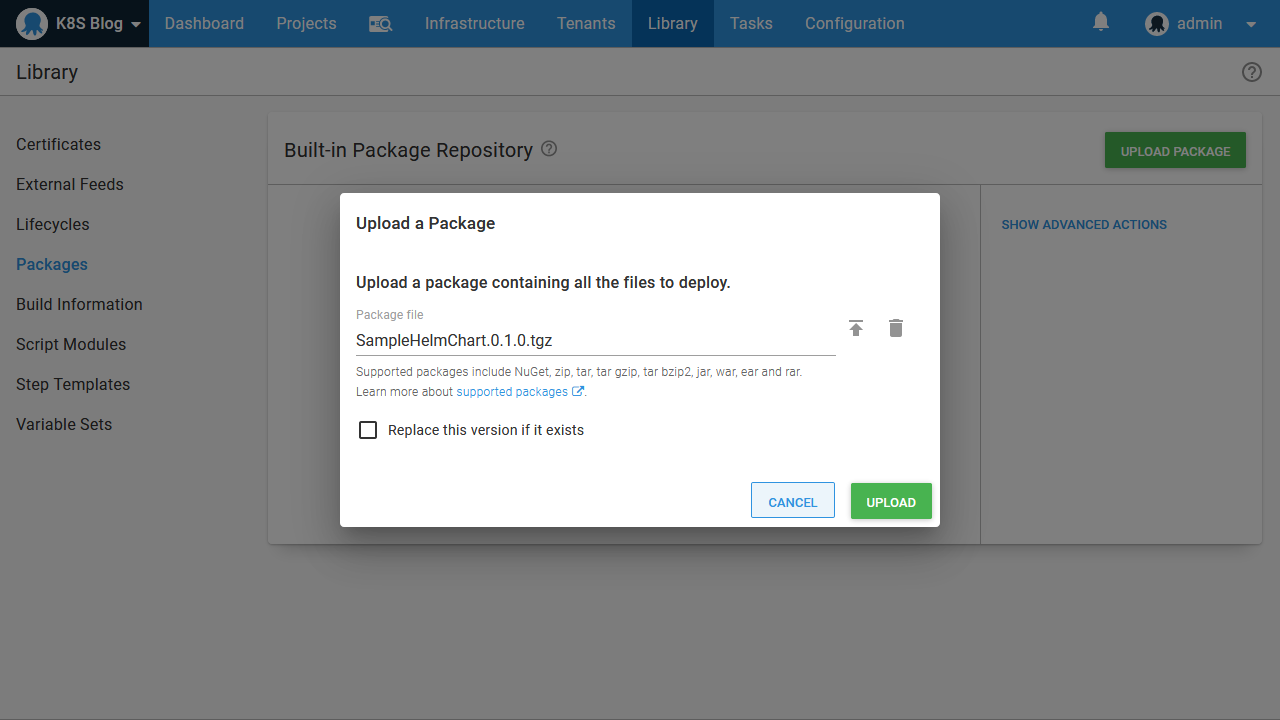 However, starting with version 2020.3.0, Octopus offers the ability to upload Helm charts directly to the built-in feed. This removes the need to configure a separate chart repository. The only requirement to upload a chart to the built-in feed is that the package version is appended to the filename after a period, meaning we need to rename the chart file from SampleHelmChart-0.1.0.tgz to SampleHelmChart.0.1.0.tgz before it is uploaded: