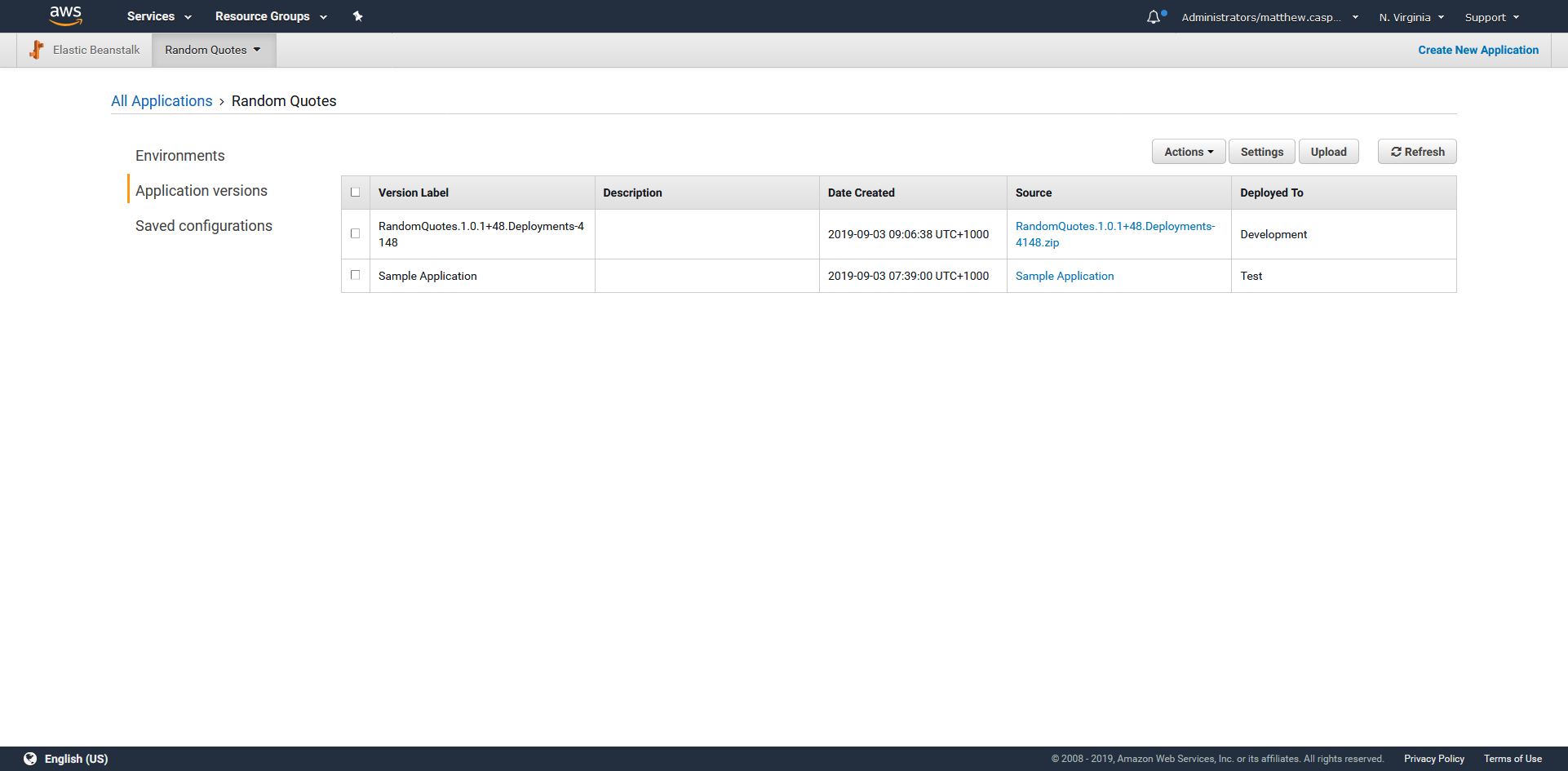 The AWS CLI is used to consume the file we uploaded to S3 and assign it a version label. When this is complete, our Beanstalk application will have a new application version that can be deployed to an environment: