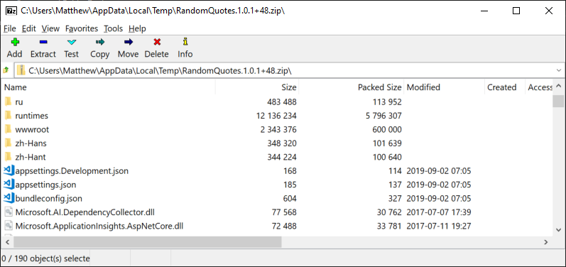 The end result of this is a file called something like RandomQuotes.1.0.1+45.Deployments-4147.zip.