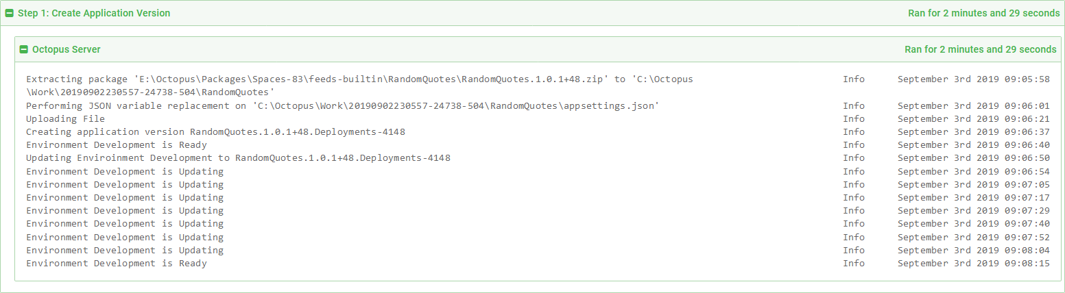 The log message Performing JSON variable replacement on 'C:\Octopus\Work\20190902230557-24738-504\RandomQuotes\appsettings.json' shows that Octopus has successfully processed the appsettings.json file and injected the values we wanted to override.