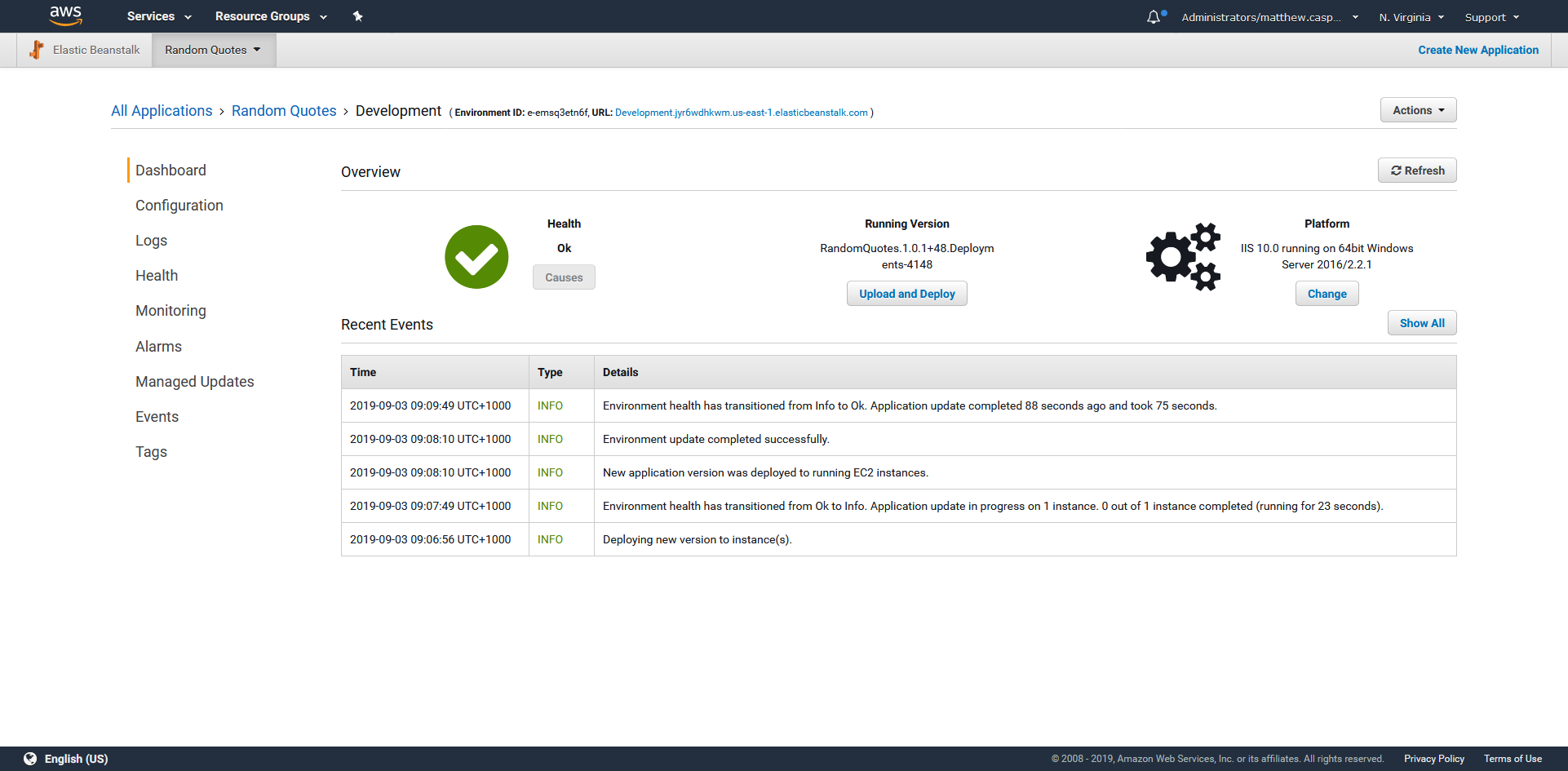 At the top level of any Beanstalk infrastructure is the application. Conceptually, an application is a space that contains application versions and environments. Typically an application is named to identify the deployment that it represents. In this post, we will deploy the Random Quotes application, so the Beanstalk application will be called Random Quotes.