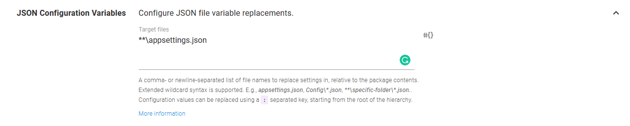 AppSettings:EnvironmentNameThe value of the EnvironmentName property in the appsettings.json file. This variable is used by the JSON configuration variables feature.