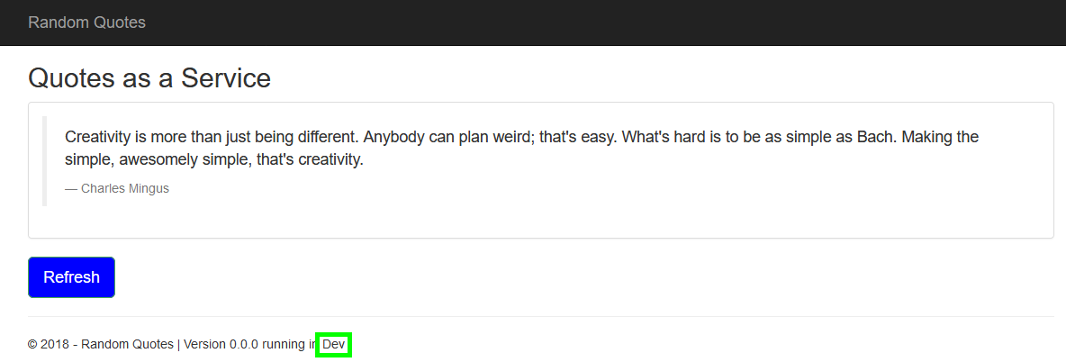 If we open the resulting deployed application, we can see it shows the environment we deployed to is called Dev. This is a subtle change from the default value in the appsettings.json file, which listed the environment as DEV (in all capitals).