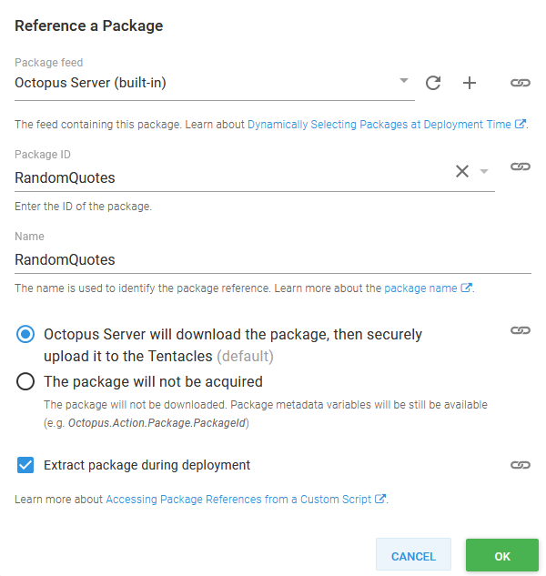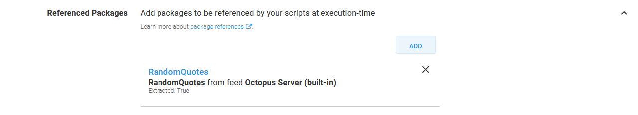 The .NET application archive is included in this step as a reference package. We called this package RandomQuotes and have set it to be extracted during deployment, which means the contents of the package can be found under the path referenced by the $OctopusParameters["Octopus.Action.Package[RandomQuotes].ExtractedPath"] variable.