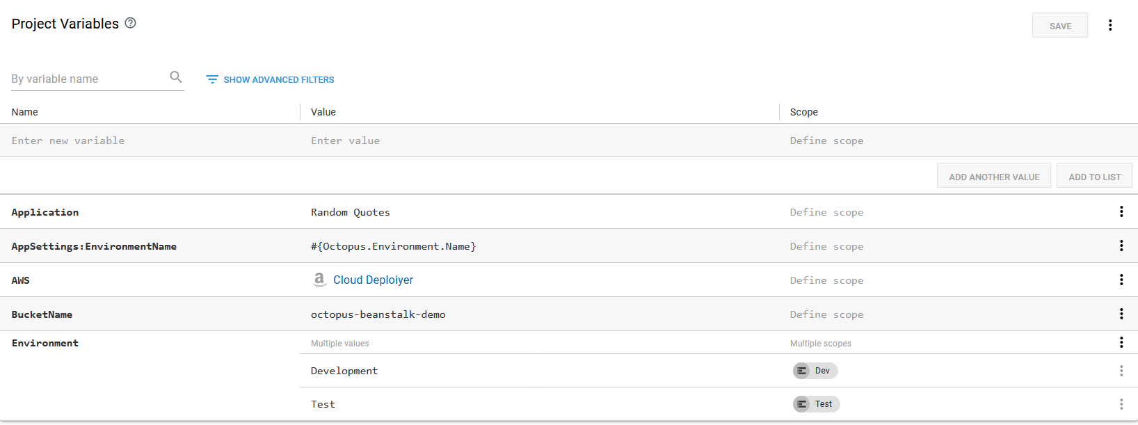 The variables $Application and $BucketName are provided by Octopus and map to the values from the project variables.
