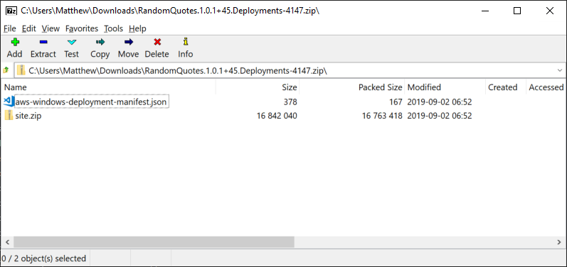 The end result of this is a file called something like RandomQuotes.1.0.1+45.Deployments-4147.zip.