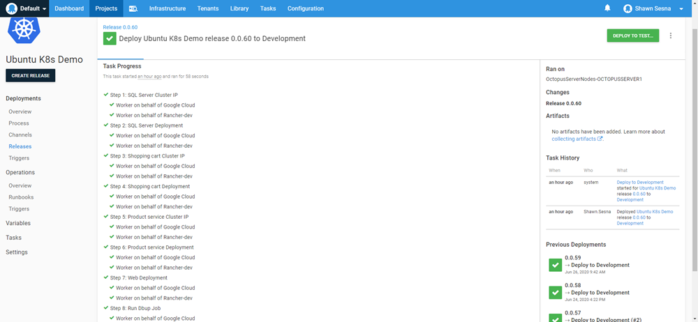 When I deploy the release, I can see it executed against both the on-premises cluster Rancher-dev and the Google Cloud cluster:
