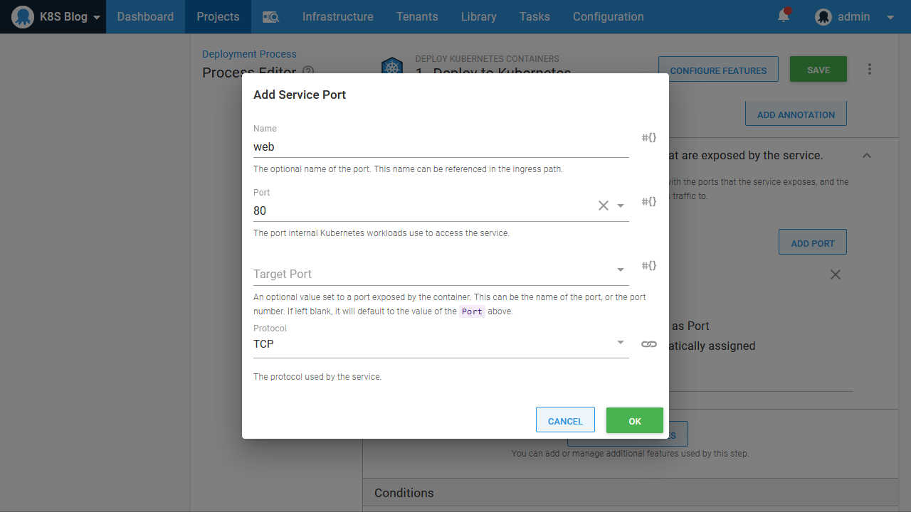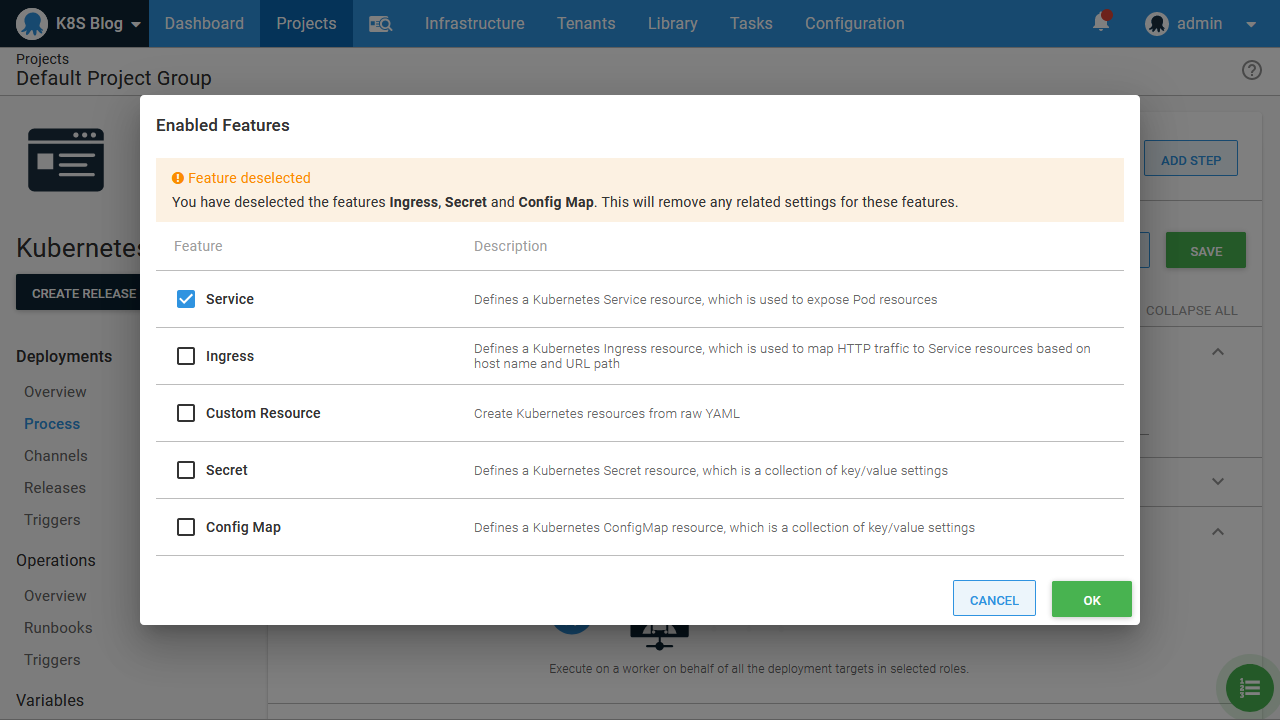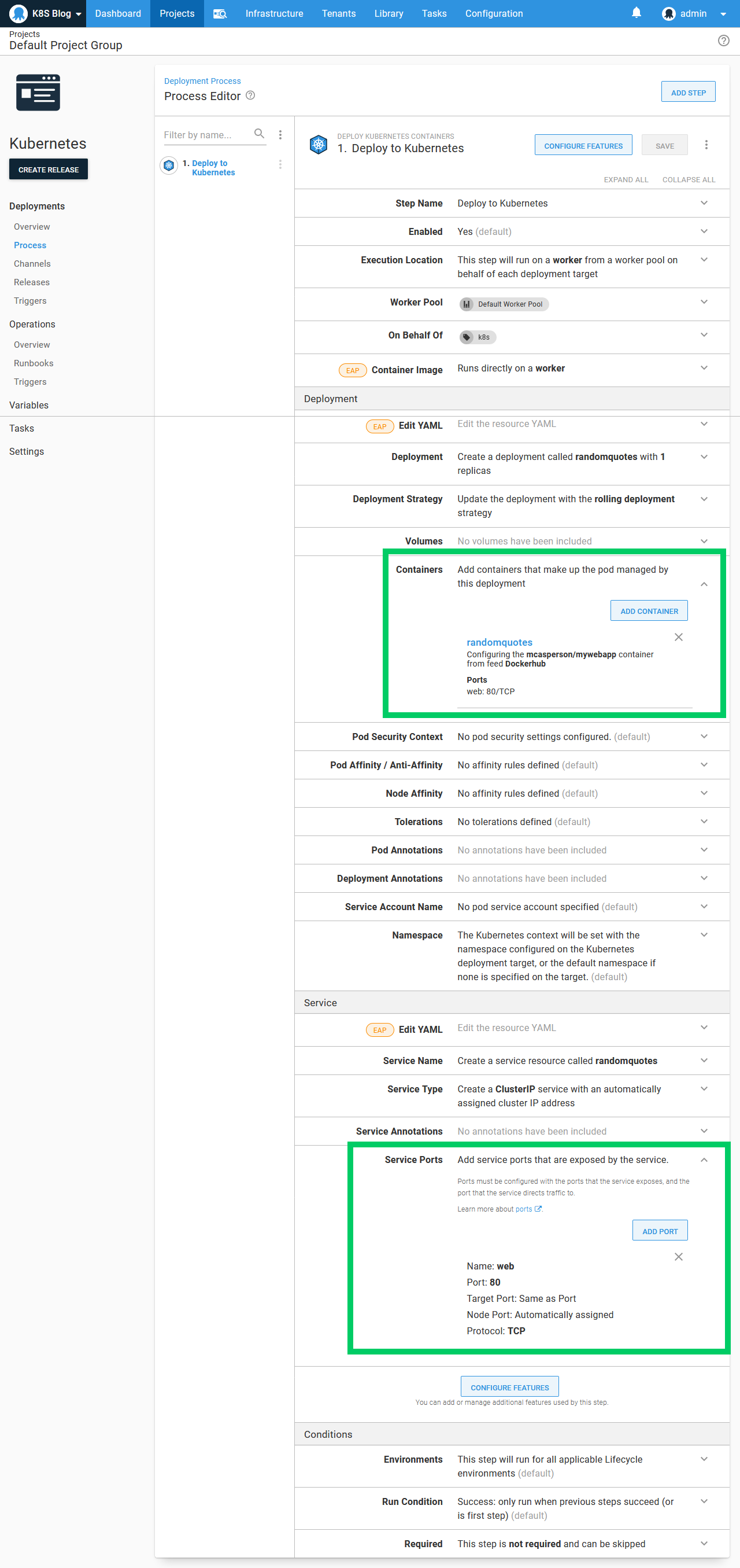 That is all we need to configure to deploy our image to Kubernetes. When we deploy this project, Octopus will perform some logic behind the scenes to create the Kubernetes deployment and services resources, and link the two together. Linking these resources saves us from some manual work that would otherwise be required to expose a deployment with a service.