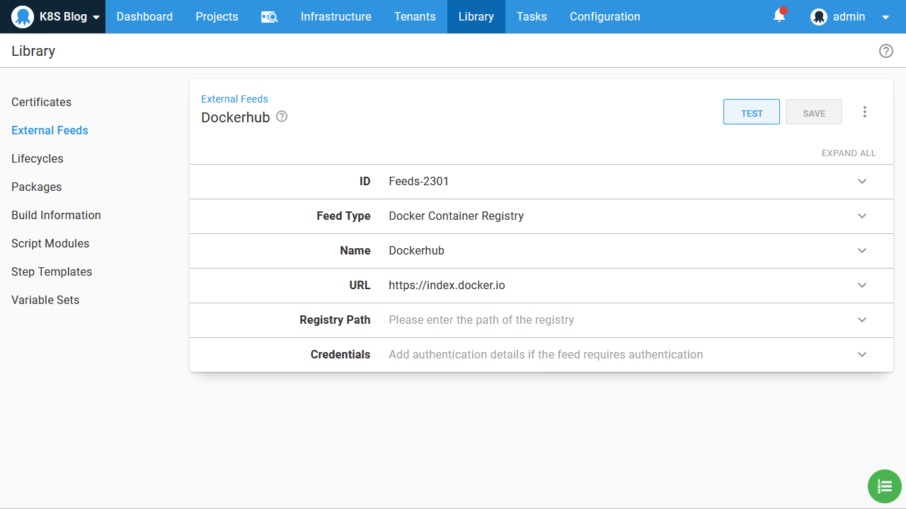 All packages referenced by Octopus during deployment are sourced from feeds. In order to use our new Docker image in a Kubernetes deployment, we need to configure Docker Hub as a Docker feed via the URL https://index.docker.io: