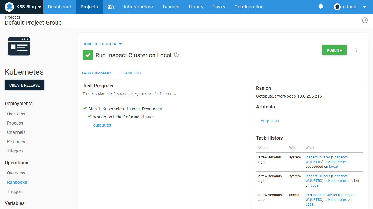 kubectlexecutable only needs to be available on the worker, removing the need for users to install this tooling locally. - The output of this runbook is captured in the Octopus logs and as an artifact generated by the step, making it easy to go back and review the state of the cluster that led to certain actions being taken.