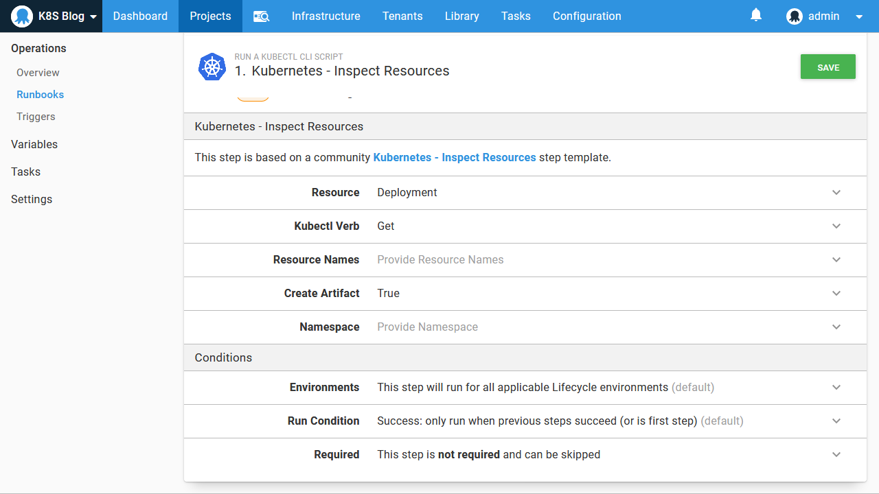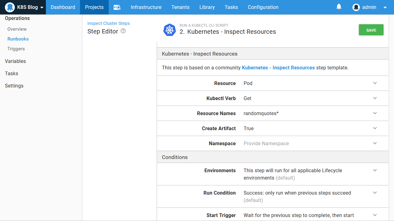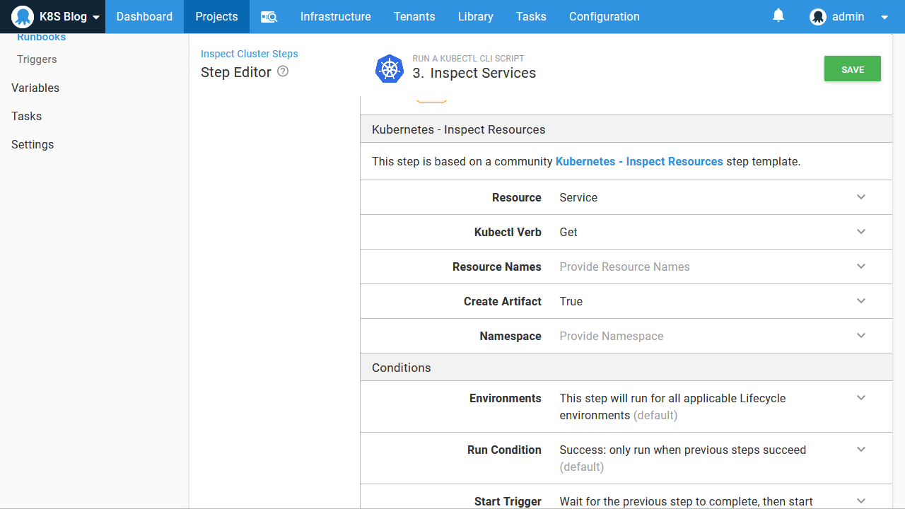 To automate the calls to kubectl we made in the last section, we’ll take advantage of a community step template called Kubernetes - Inspect Resources: