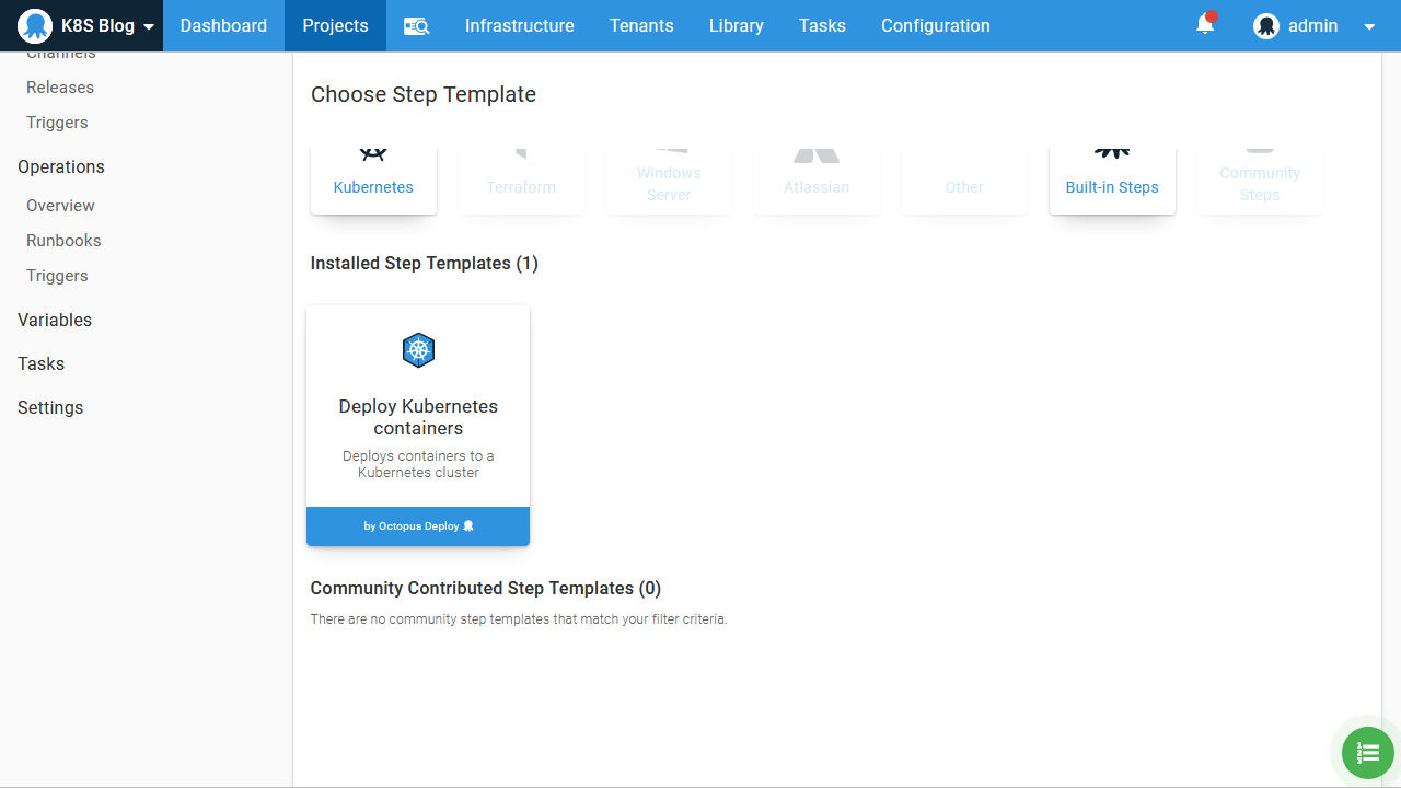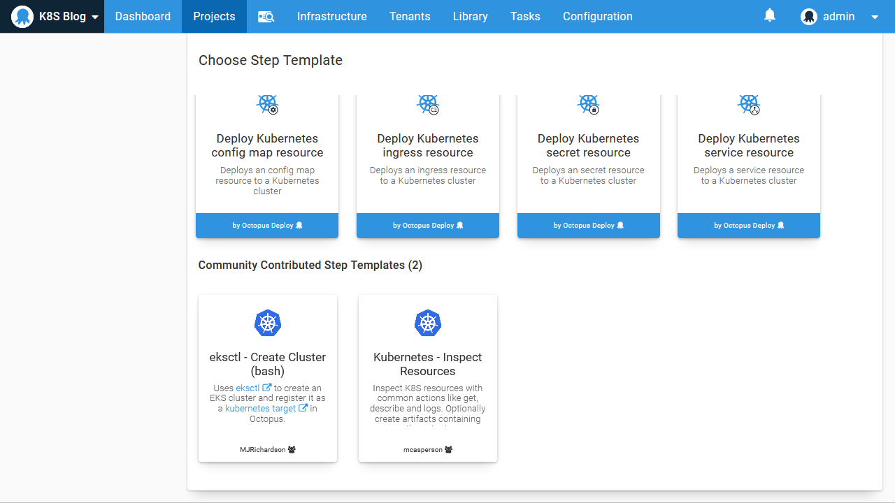 Octopus ships with a number of steps that support Kubernetes deployments. Broadly speaking, they fall into three categories: