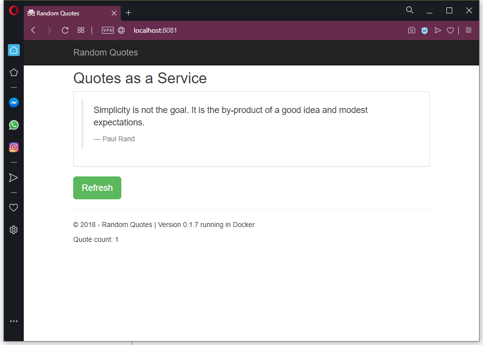 To access the service from our local PC, we need to use kubectl to proxy a local port to the service port, which we do with the command kubectl port-forward svc/randomquotes 8081:80. We can then open our application on http://localhost:8081: