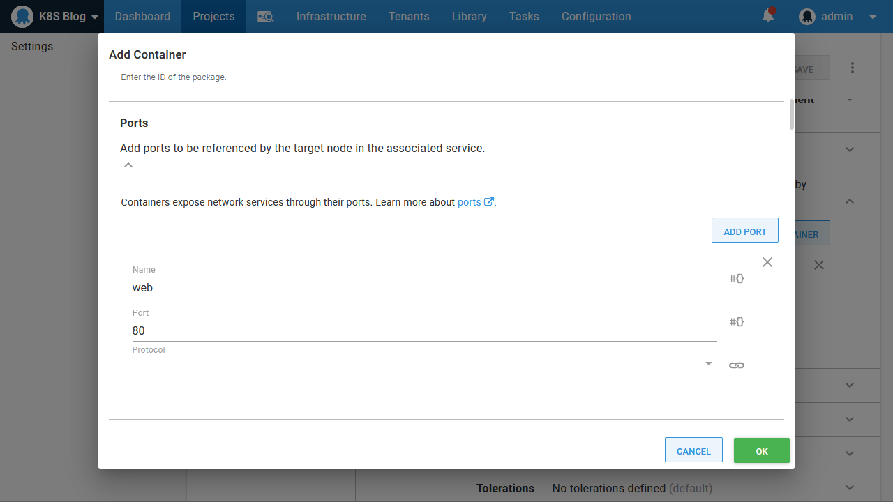 The first is the definition of the container, and the second is the service ports. These have been highlighted in the screenshot below: