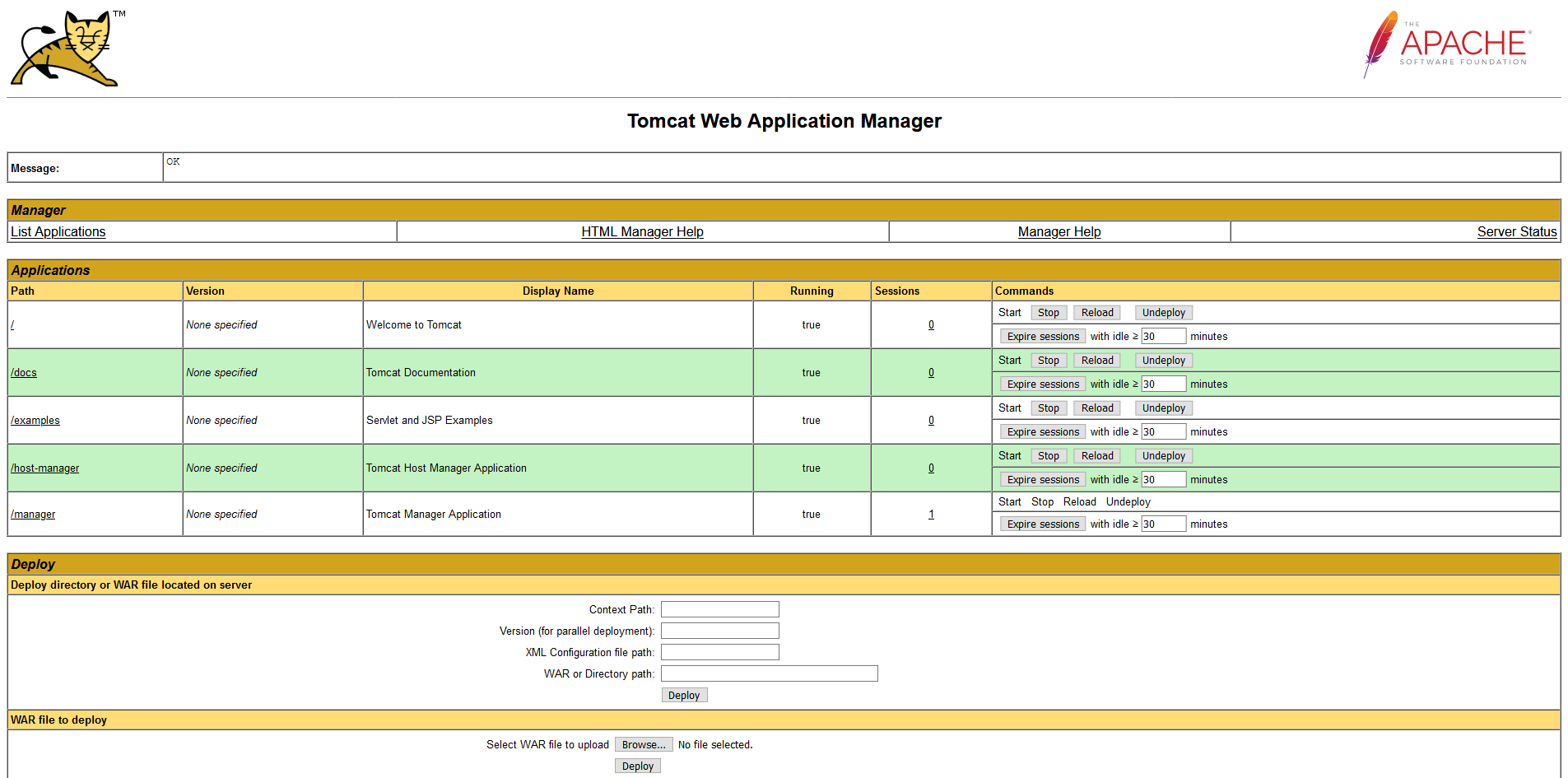 To open the manager application, open the URL http://localhost:8080/manager/html. Enter tomcat for the username, and your-password for the password: