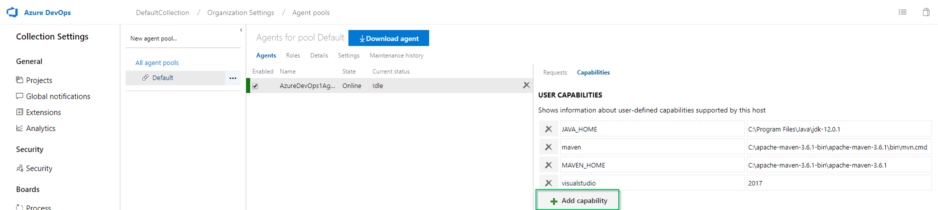 If you’re creating a new build agent, this step might not be necessary, part of the agent installation scans the machine for capabilities and will automatically add Maven if it’s found. If you’re using an existing agent, you need to go into Azure DevOps (ADO) and add the capability to the agent manually.