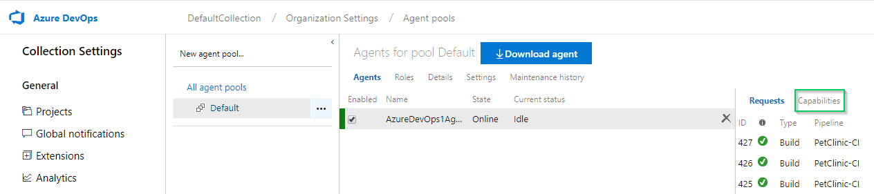 Navigate to the Agent Pools section of ADO. Select the agent you want to modify and click Capabilities: