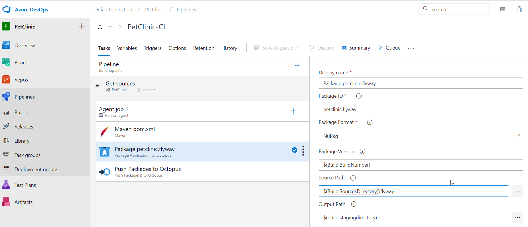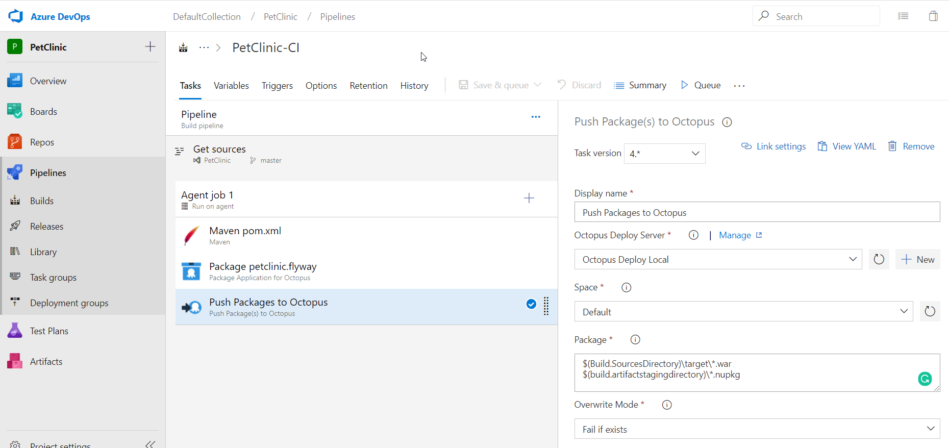 That’s it for the Maven task. .war is a supported file type for the built-in package repository in Octopus Deploy, so there’s no need to package the Java application.