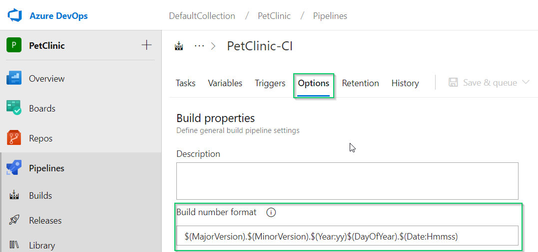 You’ll note that there are two additional variables defined; MajorVersion and MinorVersion. I use these variables to create my Build Number format within ADO. To set this, click the Options tab and fill in the Build number format, I used $(MajorVersion).$(MinorVersion).$(Year:yy)$(DayOfYear).$(Date:Hmmss):