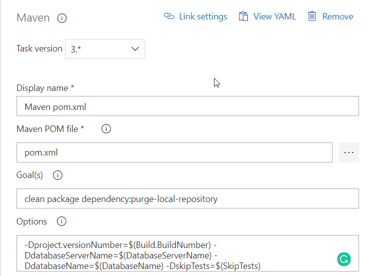 -Dproject.versionNumber=$(Build.BuildNumber) -DdatabaseServerName=$(DatabaseServerName) -DdatabaseName=$(DatabaseName) -DskipTests=$(SkipTests)